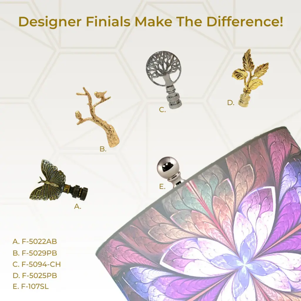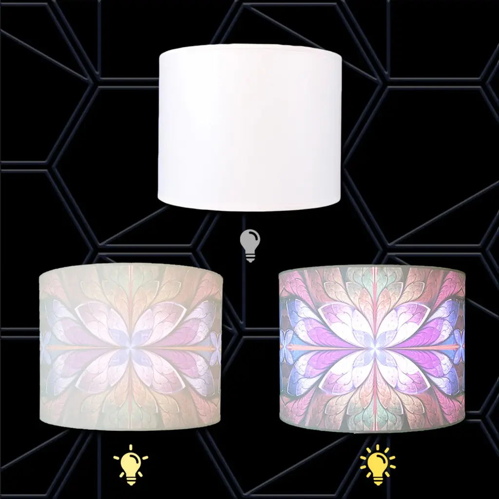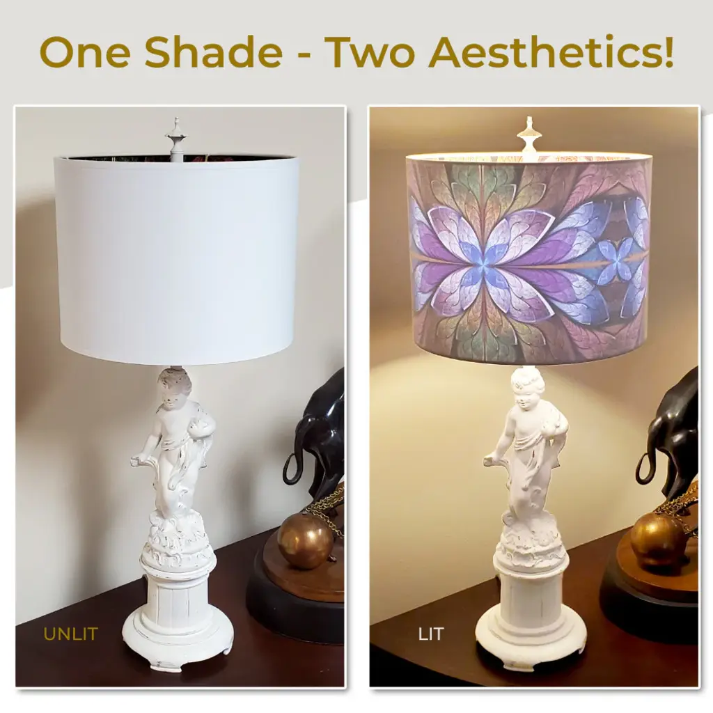 SHAPE and DIMENSIONS: This shallow drum hardback shade is measured as (Top Diameter x Bottom Diameter x Slant Height) and comes in the following sizes:10 x 10 x 812 x 12 x 8.514 x 14 x 9SHINE-THROUGH DESIGN: The understated white exterior shows the design of the interior lining when lit, offering a unique silhouette effect that is sure to amaze!WASHER: Standard (0.5-inch recess) brass-finish spider fitter w/ trademark stamping. (Shades with 9-inch+ top diameter have a V-Notch fitter for use with a 6-inch or 8-inch reflector bowl)FRAME: Our heavy-grade rust-resistant metal frame is thicker than typical lampshade frames, giving it a superior structure that will help it last for years.QUALITY MATTERS: This shade design is printed on high-quality hardback polystyrene material at a state-of-the-art printing facility. Made in the U.S.A.