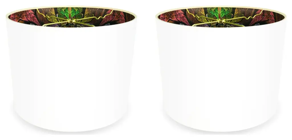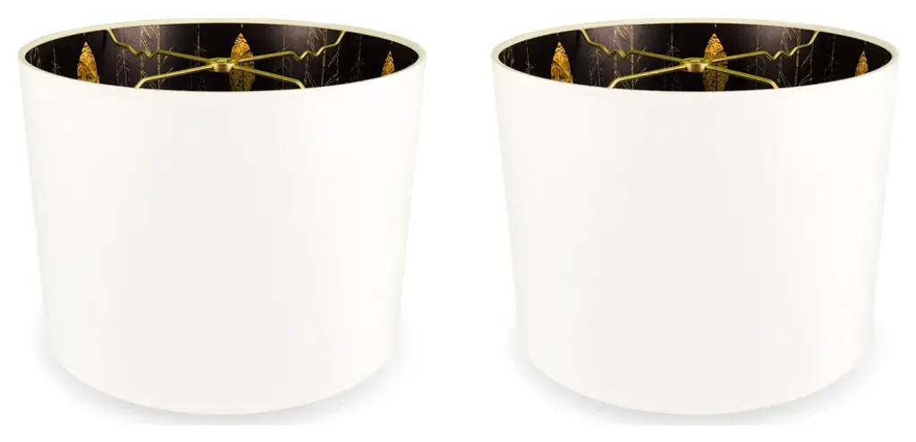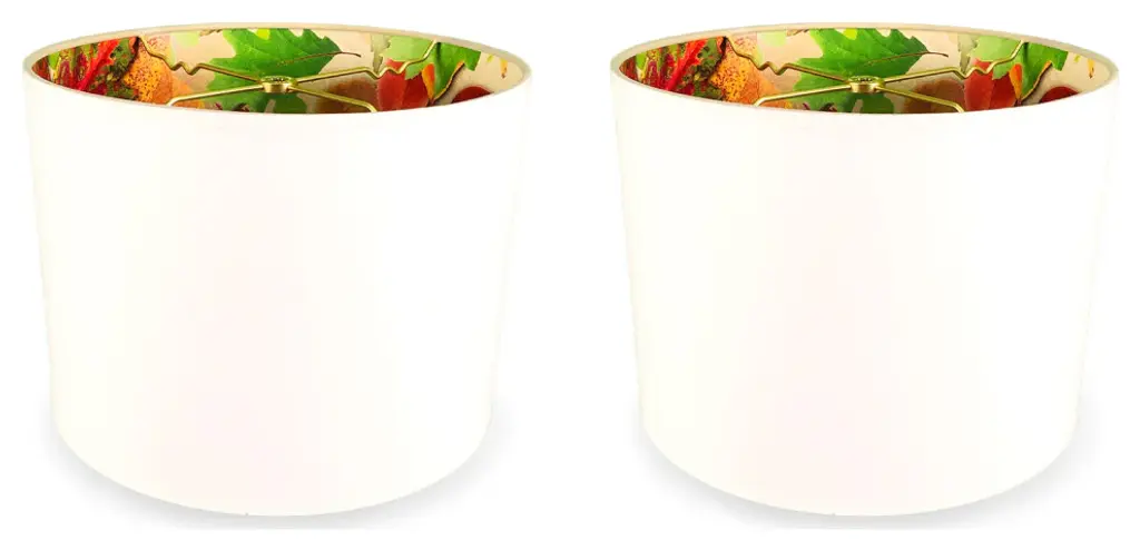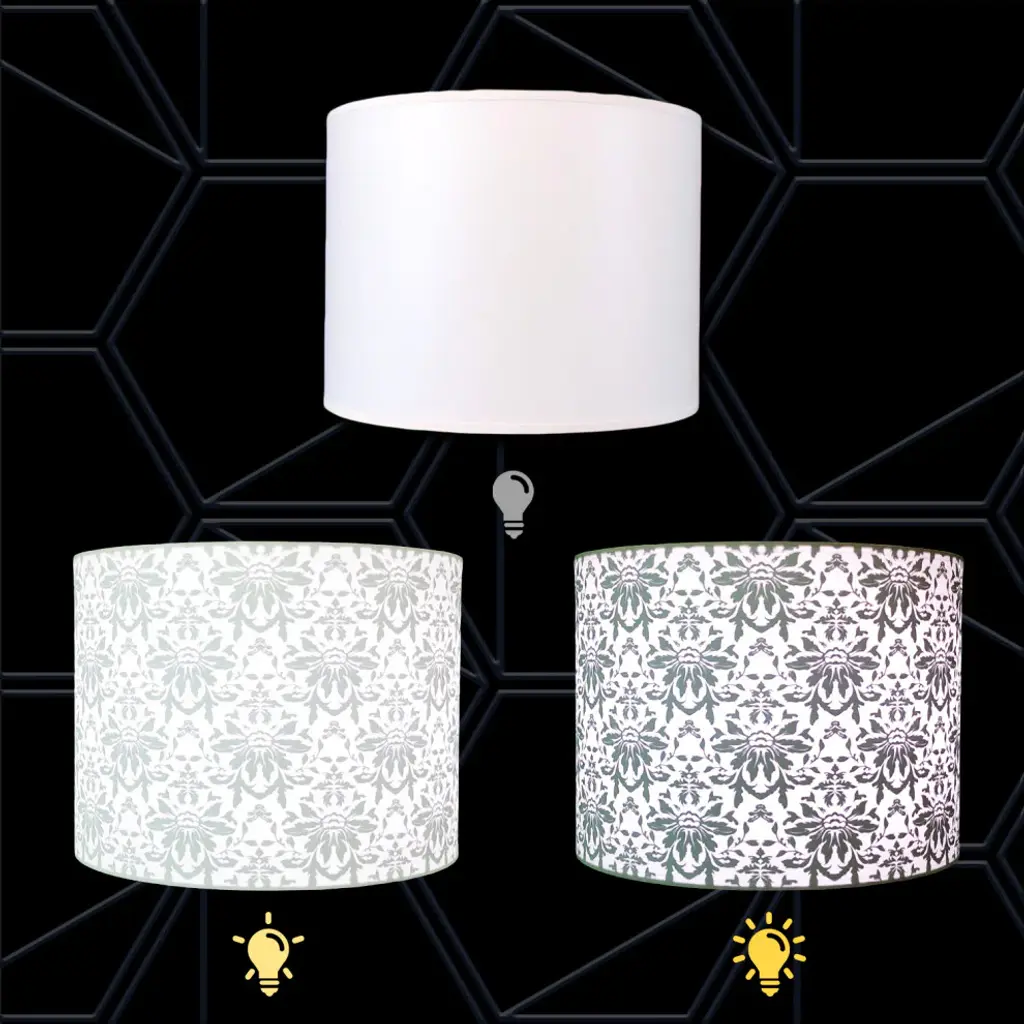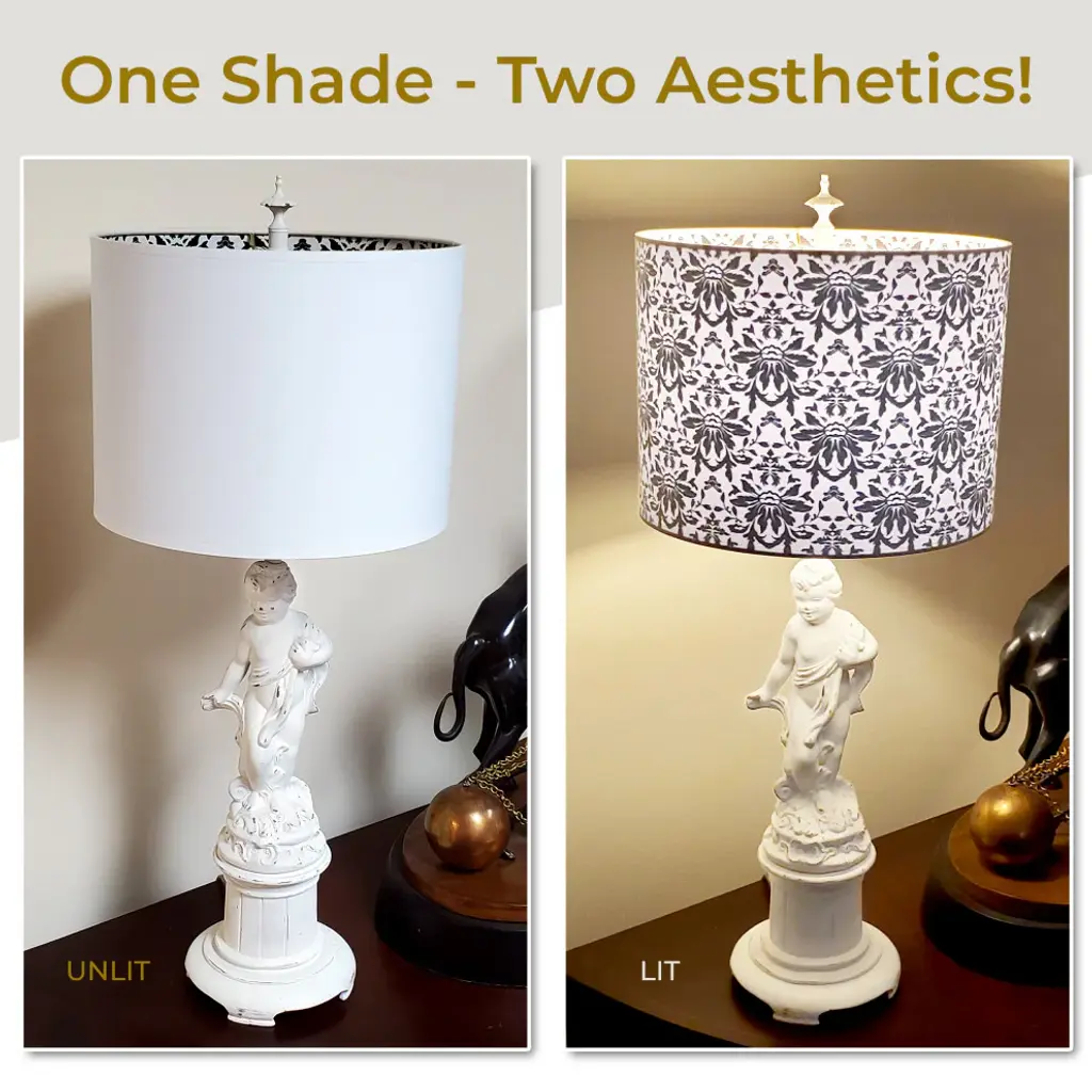 SHAPE and DIMENSIONS: This shallow drum hardback shade is measured as (Top Diameter x Bottom Diameter x Slant Height) and comes in the following sizes:10 x 10 x 812 x 12 x 8.514 x 14 x 9SHINE-THROUGH DESIGN: The understated white exterior shows the design of the interior lining when lit, offering a unique silhouette effect that is sure to amaze!WASHER: Standard (0.5-inch recess) brass-finish spider fitter w/ trademark stamping. (Shades with 9-inch+ top diameter have a V-Notch fitter for use with a 6-inch or 8-inch reflector bowl)FRAME: Our heavy-grade rust-resistant metal frame is thicker than typical lampshade frames, giving it a superior structure that will help it last for years.QUALITY MATTERS: This shade design is printed on high-quality hardback polystyrene material at a state-of-the-art printing facility. Made in the U.S.A.