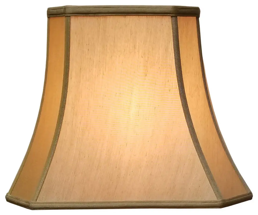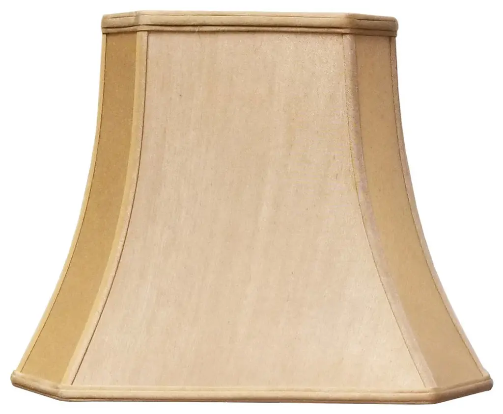 The Rectangle Cut Corner Lamp Shade flares slightly towards the bottom, showcasing beautiful cut corners and clean lines. Perfect for narrow tables where you need light, but don''t have room for a round shade. This shade comes in a variety of fabrics and color options, and is versatile for use in traditional, transitional and modern homes. The Rectangle Cut Corner Lamp Shade is part of the Royal Designs, Inc. Timeless™ Basic Shade Collection. Royal Designs has been in the lamp shade business since 1993 with our multiple shade lines that exemplify handcrafted quality and value. Height is measured by slant height from top to bottom of the lampshades"™ front face. Measurements listed as (TOP x BOTTOM x HEIGHT). Please measure your existing shade--a replacement harp may be needed for a proper fit or additional adjustment if changing height of shade. Exterior Fabric: Hand Tailored Silk-Type Shantung (except Linen, Mouton, Burlap & Faux Rawhide fabrics) Interior Fabric: Off-White Softback Lining (Black, Burlap & Faux Rawhide fabrics have gold lining) Washer: Standard brass-finish spider fitter, use a finial to fasten shade.Trim: Top and bottom trim (single or double) with vertical piping Frame: Heavy grade rust resistant metal frame Bulb: Suggested maximum wattage is 150-watt for most sizesHeight is measured by slant height from top to bottom of the lampshades front facePlease measure your existing shade--a replacement harp may be needed for a proper fit or additional adjustment if changing height of shade