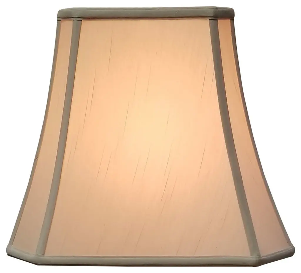 The Rectangle Cut Corner Lamp Shade flares slightly towards the bottom, showcasing beautiful cut corners and clean lines. Perfect for narrow tables where you need light, but don''t have room for a round shade. This shade comes in a variety of fabrics and color options, and is versatile for use in traditional, transitional and modern homes. The Rectangle Cut Corner Lamp Shade is part of the Royal Designs, Inc. Timeless™ Basic Shade Collection. Royal Designs has been in the lamp shade business since 1993 with our multiple shade lines that exemplify handcrafted quality and value. Height is measured by slant height from top to bottom of the lampshades"™ front face. Measurements listed as (TOP x BOTTOM x HEIGHT). Please measure your existing shade--a replacement harp may be needed for a proper fit or additional adjustment if changing height of shade. Exterior Fabric: Hand Tailored Silk-Type Shantung (except Linen, Mouton, Burlap & Faux Rawhide fabrics) Interior Fabric: Off-White Softback Lining (Black, Burlap & Faux Rawhide fabrics have gold lining) Washer: Standard brass-finish spider fitter, use a finial to fasten shade.Trim: Top and bottom trim (single or double) with vertical piping Frame: Heavy grade rust resistant metal frame Bulb: Suggested maximum wattage is 150-watt for most sizesHeight is measured by slant height from top to bottom of the lampshades front facePlease measure your existing shade--a replacement harp may be needed for a proper fit or additional adjustment if changing height of shade