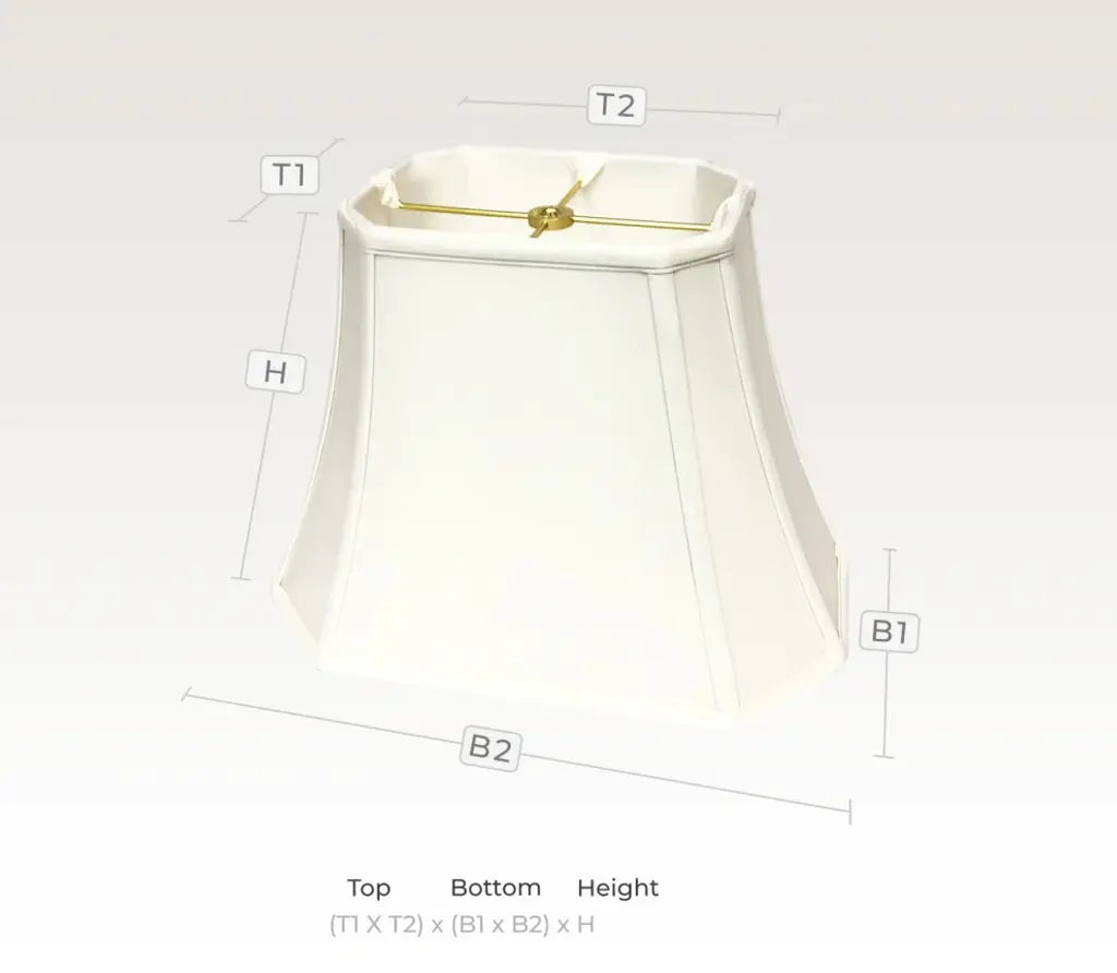 The Rectangle Cut Corner Basic Lamp Shade is part of the Royal Designs, Inc. Timeless Basic Shade Collection and is a traditional yet stunning way to finish the look of your lamp. Our fancy lampshade makes a subtle statement and will turn your floor lamp or table lamp into a talking piece. We have decades of experience in the business of lampshades and we''re proud to offer multiple product lines that exemplify handcrafted quality and value. Be sure to browse our vast collection of shades in a wide variety of distinctive shapes that will add a new level of sophistication to your lighting and home decor.Height is measured on the slant from the top to the bottom of the lamp shade''s front face.DIMENSION: Our traditional basic corner cut lamp shade measures (5 x 6.5)" x (8 x 12)" x 10" (Top Diameter x Bottom Diameter x Slant Height)DIMENSION: Our traditional basic corner cut lamp shade measures (6 x 8)" x (9 x 14)" x 10.5" (Top Diameter x Bottom Diameter x Slant Height)DIMENSION: Our traditional basic corner cut lamp shade measures (7 x 9)" x (10.25 x 16)" x 12.25" (Top Diameter x Bottom Diameter x Slant Height)DIMENSION: Our traditional basic corner cut lamp shade measures (7 x 10)" x (12.25 x 18)" x 13.25" (Top Diameter x Bottom Diameter x Slant Height)MATERIALS: Our classic lampshade is made from premium silk-type shantung fabric and sturdy off-white styrene lining.EASY TO USE: The standard spider fitter works with most lamps and is held in place by any final or cap.TRADITIONAL DESIGN: Works perfectly with floor lamps or tall table lamps with a small to medium base. Our shade will also fit in beautifully in transitional and modern home decors.APPLICATION: Use our lamp shade for table lamps, accent lamps, vintage lamps, and even candlestick lamps! The timeless design is great for any room.Specification:Brand: Royal Designs, Inc.Type: Rectangle Lamp ShadeMaterial: FabricShape: Rectangle