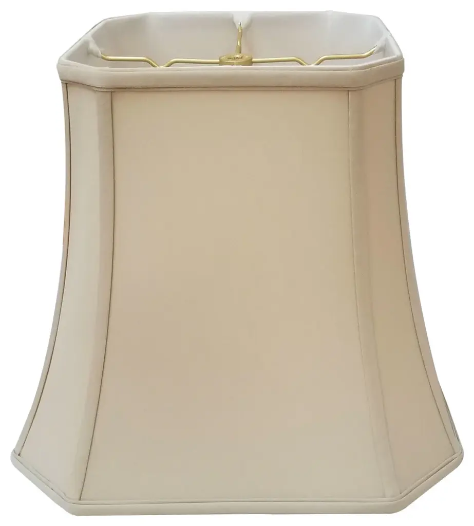 The Rectangle Cut Corner Lamp Shade flares slightly towards the bottom, showcasing beautiful cut corners and clean lines. Perfect for narrow tables where you need light, but don''t have room for a round shade. This shade comes in a variety of fabrics and color options, and is versatile for use in traditional, transitional and modern homes. The Rectangle Cut Corner Lamp Shade is part of the Royal Designs, Inc. Timeless™ Basic Shade Collection. Royal Designs has been in the lamp shade business since 1993 with our multiple shade lines that exemplify handcrafted quality and value. Height is measured by slant height from top to bottom of the lampshades"™ front face. Measurements listed as (TOP x BOTTOM x HEIGHT). Please measure your existing shade--a replacement harp may be needed for a proper fit or additional adjustment if changing height of shade. Exterior Fabric: Hand Tailored Silk-Type Shantung (except Linen, Mouton, Burlap & Faux Rawhide fabrics) Interior Fabric: Off-White Softback Lining (Black, Burlap & Faux Rawhide fabrics have gold lining) Washer: Standard brass-finish spider fitter, use a finial to fasten shade.Trim: Top and bottom trim (single or double) with vertical piping Frame: Heavy grade rust resistant metal frame Bulb: Suggested maximum wattage is 150-watt for most sizesHeight is measured by slant height from top to bottom of the lampshades front facePlease measure your existing shade--a replacement harp may be needed for a proper fit or additional adjustment if changing height of shade