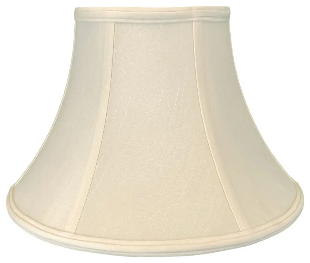 This Shallow Bell Basic Lampshade is a part of Royal Designs, Inc. Timeless Basic Shade Collection and is perfect for anyone who is looking for a traditional yet stunning lampshade. Royal Designs has been in the lampshade business since 1993 with their multiple shade lines that exemplify handcrafted quality and value. Exterior Fabric: Hand Tailored Silk-Type Shantung (except Linen, Mouton, Burlap & Faux Rawhide fabrics) Interior Fabric: Off-White Softback Lining (Black, Burlap & Faux Rawhide fabrics have gold lining) Washer: Standard brass-finish spider fitter, use a finial to fasten shade. (All shades with 9 in + top diameter have a V-Notch fitter for use on a 6 in or 8 in reflector bowl) Trim: Top and bottom trim (single or double) with vertical piping Frame: Heavy grade rust resistant metal frame Bulb: Suggested maximum wattage is 150-watt for most sizesHeight is measured by slant height from top to bottom of the lampshades front facePlease measure your existing shade--a replacement harp may be needed for a proper fit or additional adjustment if changing height of shade