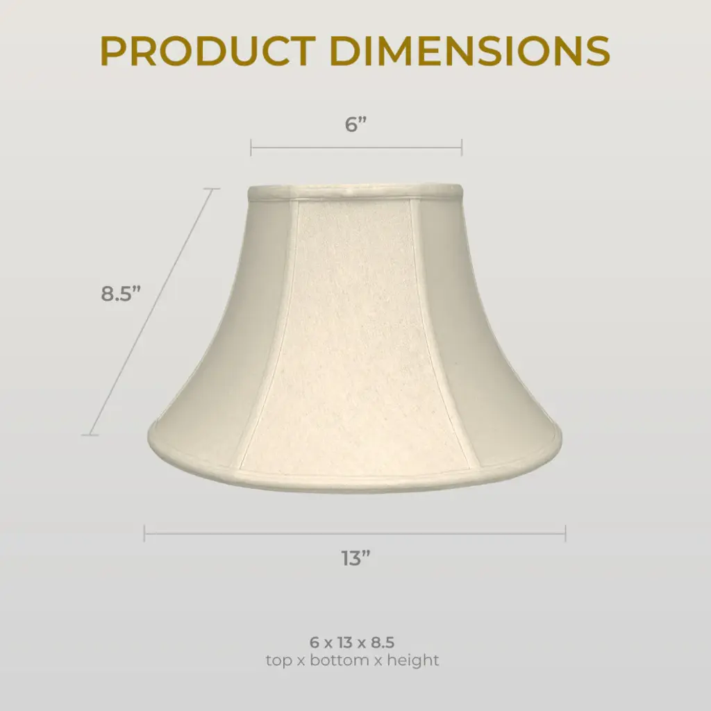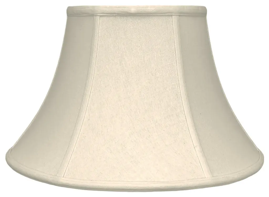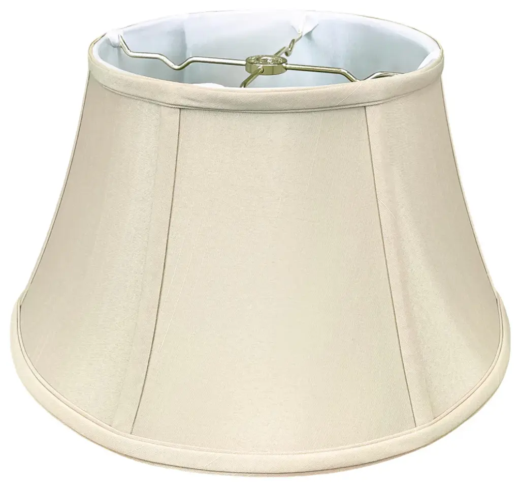 The Shallow Bell Lamp Shade is the condensed version of the traditional bell shape. The dimensions of this shade are meant to counter-balance lamps with a more voluminous base. This shade also comes in a wall shade option for use in tight spaces where a narrow width is required. With a variety of fabrics and color options, it is versatile enough for use in traditional, transitional and modern homes. The Shallow Bell Lamp Shade is part of the Royal Designs, Inc. Timeless™ Basic Shade Collection. Royal Designs has been in the lamp shade business since 1993 with our multiple shade lines that exemplify handcrafted quality and value. Height is measured by slant height from top to bottom of the lampshades"™ front face. Measurements listed as (TOP x BOTTOM x HEIGHT). Please measure your existing shade--a replacement harp may be needed for a proper fit or additional adjustment if changing height of shade. Exterior Fabric: Hand Tailored Silk-Type Shantung (except Linen, Mouton, Burlap & Faux Rawhide fabrics) Interior Fabric: Off-White Softback Lining (Black, Burlap & Faux Rawhide fabrics have gold lining) Washer: Standard brass-finish spider fitter, use a finial to fasten shade. (All shades with 9 in + top diameter have a V-Notch fitter for use on a 6 in or 8 in reflector bowl) Trim: Top and bottom trim (single or double) with vertical piping Frame: Heavy grade rust resistant metal frame Bulb: Suggested maximum wattage is 150-watt for most sizesHeight is measured by slant height from top to bottom of the lampshades front facePlease measure your existing shade--a replacement harp may be needed for a proper fit or additional adjustment if changing height of shade