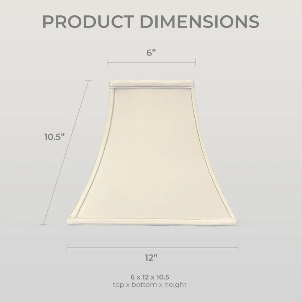 The Square Bell Basic Lampshade is a part of Royal Designs, Inc. Regal™ Basic Shade Collection. Featuring curved lines, upgrade the look of your lamp with our classic square bell lampshade. Perfect for updating or repairing an antique or cherished home lamp. Royal Designs has been in the lampshade business since 1993 with its multiple shade lines that exemplify handcrafted quality and value. Height is measured by slant height from top to bottom of the lampshades"™ front face. Measurements listed as (Top Diameter x Bottom Diameter x Slant Height). Please measure your existing shade--a replacement harp may be needed for a proper fit or additional adjustment if changing the height of the shade.DIMENSION: Our traditional basic square bell shade measures 5" x 10" x 9" (Top Diameter x Bottom Diameter x Slant Height)DIMENSION: Our traditional basic square bell shade measures 6" x 12" x 10.5" (Top Diameter x Bottom Diameter x Slant Height)DIMENSION: Our traditional basic square bell shade measures 7" x 14" x 11.5" (Top Diameter x Bottom Diameter x Slant Height)MATERIALS: Our classic lampshade is made from premium silk-type shantung fabric and sturdy off-white styrene lining.EASY TO USE: The standard spider fitter works with most lamps and is held in place by any final or cap.TRADITIONAL DESIGN: Works perfectly with floor lamps or tall table lamps with a small to medium base. Our shade will also fit in beautifully in transitional and modern home decors.APPLICATION: Use our lamp shade for table lamps, accent lamps, vintage lamps, and even candlestick lamps! The timeless design is great for any room.