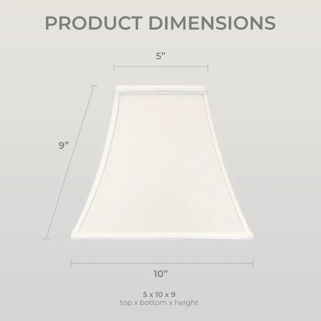 The Square Bell Basic Lampshade is a part of Royal Designs, Inc. Regal™ Basic Shade Collection. Featuring curved lines, upgrade the look of your lamp with our classic square bell lampshade. Perfect for updating or repairing an antique or cherished home lamp. Royal Designs has been in the lampshade business since 1993 with its multiple shade lines that exemplify handcrafted quality and value. Height is measured by slant height from top to bottom of the lampshades"™ front face. Measurements listed as (Top Diameter x Bottom Diameter x Slant Height). Please measure your existing shade--a replacement harp may be needed for a proper fit or additional adjustment if changing the height of the shade.DIMENSION: Our traditional basic square bell shade measures 5" x 10" x 9" (Top Diameter x Bottom Diameter x Slant Height)DIMENSION: Our traditional basic square bell shade measures 6" x 12" x 10.5" (Top Diameter x Bottom Diameter x Slant Height)DIMENSION: Our traditional basic square bell shade measures 7" x 14" x 11.5" (Top Diameter x Bottom Diameter x Slant Height)MATERIALS: Our classic lampshade is made from premium silk-type shantung fabric and sturdy off-white styrene lining.EASY TO USE: The standard spider fitter works with most lamps and is held in place by any final or cap.TRADITIONAL DESIGN: Works perfectly with floor lamps or tall table lamps with a small to medium base. Our shade will also fit in beautifully in transitional and modern home decors.APPLICATION: Use our lamp shade for table lamps, accent lamps, vintage lamps, and even candlestick lamps! The timeless design is great for any room.