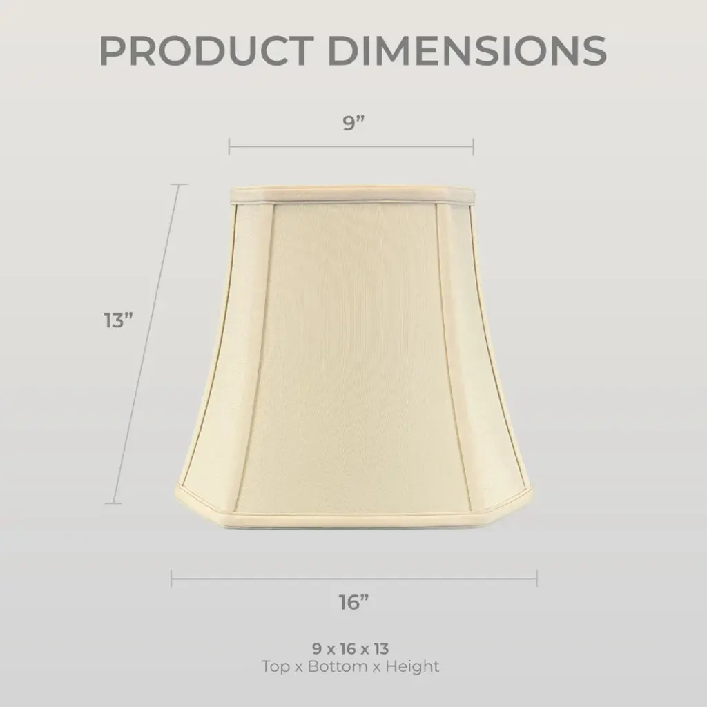 The Square Cut Corner Bell Basic Lamp Shade is part of the Royal Designs, Inc. Timeless Basic Shade Collection and is a traditional yet stunning way to finish the look of your lamp. Our fancy lampshade makes a subtle statement and will turn your floor lamp or table lamp into a talking piece. We have decades of experience in the business of lampshades and we''re proud to offer multiple product lines that exemplify handcrafted quality and value. Be sure to browse our vast collection of shades in a wide variety of distinctive shapes that will add a new level of sophistication to your lighting and home decor.Height is measured on the slant from the top to the bottom of the lamp shade''s front face.DIMENSION: Our traditional basic square corner cut lamp shade measures 5" x 10" x 8.75" (Top Diameter x Bottom Diameter x Slant Height)DIMENSION: Our traditional basic square corner cut lamp shade measures 7.5" x 12" x 10.25" (Top Diameter x Bottom Diameter x Slant Height)DIMENSION: Our traditional basic square corner cut lamp shade measures 8" x 14" x 11.25" (Top Diameter x Bottom Diameter x Slant Height)DIMENSION: Our traditional basic square corner cut lamp shade measures 9" x 16" x 13" (Top Diameter x Bottom Diameter x Slant Height)MATERIALS: Our classic lampshade is made from premium silk-type shantung fabric and sturdy off-white styrene lining.EASY TO USE: The standard spider fitter works with most lamps and is held in place by any final or cap.TRADITIONAL DESIGN: Works perfectly with floor lamps or tall table lamps with a small to medium base. Our shade will also fit in beautifully in transitional and modern home decors.APPLICATION: Use our lamp shade for table lamps, accent lamps, vintage lamps, and even candlestick lamps! The timeless design is great for any room.Specification:Brand: Royal Designs, Inc.Type: Bell Lamp ShadeMaterial: FabricShape: Square Bell