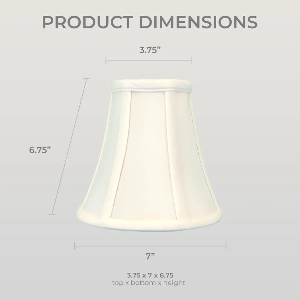 The True Bell Basic Lamp Shade is part of the Royal Designs, Inc. Timeless Basic Shade Collection and is a traditional yet stunning way to finish the look of your lamp. Our fancy lampshade makes a subtle statement and will turn your floor lamp or table lamp into a talking piece. We have decades of experience in the business of lampshades and we''re proud to offer multiple product lines that exemplify handcrafted quality and value. Be sure to browse our vast collection of shades in a wide variety of distinctive shapes that will add a new level of sophistication to your lighting and home decor.Height is measured on the slant from the top to the bottom of the lamp shade''s front face.DIMENSION: Our traditional basic true bell lamp shade measures 3.75" x 7" x 6.75" (Top Diameter x Bottom Diameter x Slant Height)DIMENSION: Our traditional basic true bell lamp shade measures 4" x 8" x 7" (Top Diameter x Bottom Diameter x Slant Height)MATERIALS: Our classic lampshade is made from premium silk-type shantung fabric and sturdy off-white styrene lining.EASY TO USE: The standard round clip works with most lamps and is held in place by any final or cap.TRADITIONAL DESIGN: Works perfectly with floor lamps or tall table lamps with a small to medium base. Our shade will also fit in beautifully in transitional and modern home decors.APPLICATION: Use our lamp shade for table lamps, accent lamps, vintage lamps, and even candlestick lamps! The timeless design is great for any room.Specification:Brand: Royal Designs, Inc.Type: Bell Lamp ShadeMaterial: FabricShape: Bell