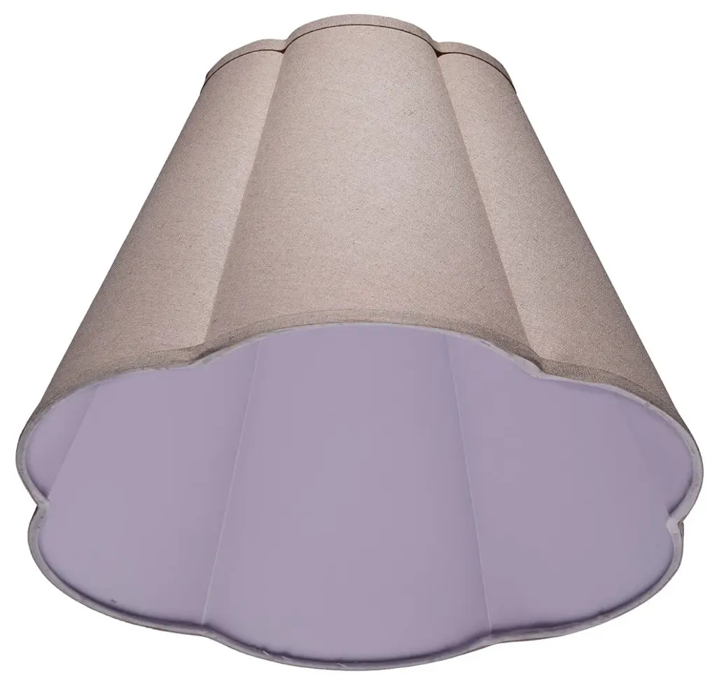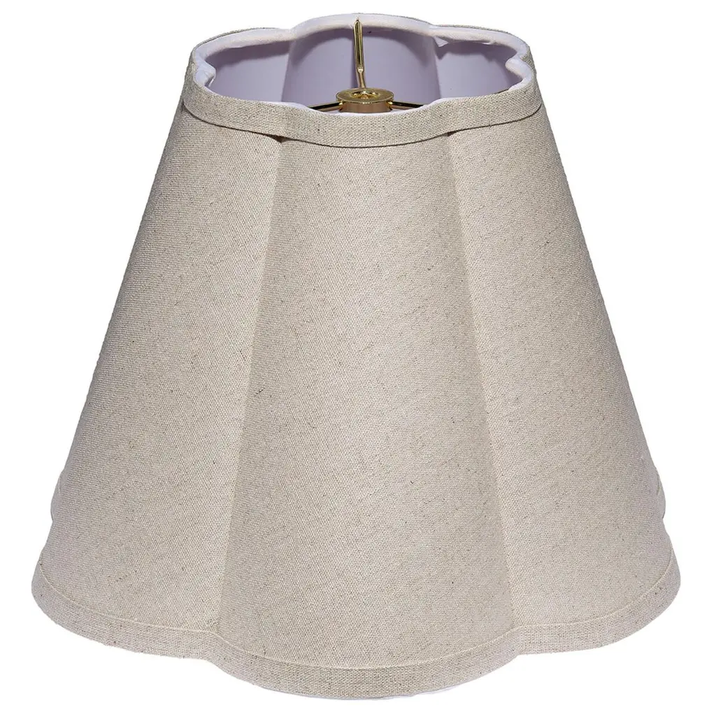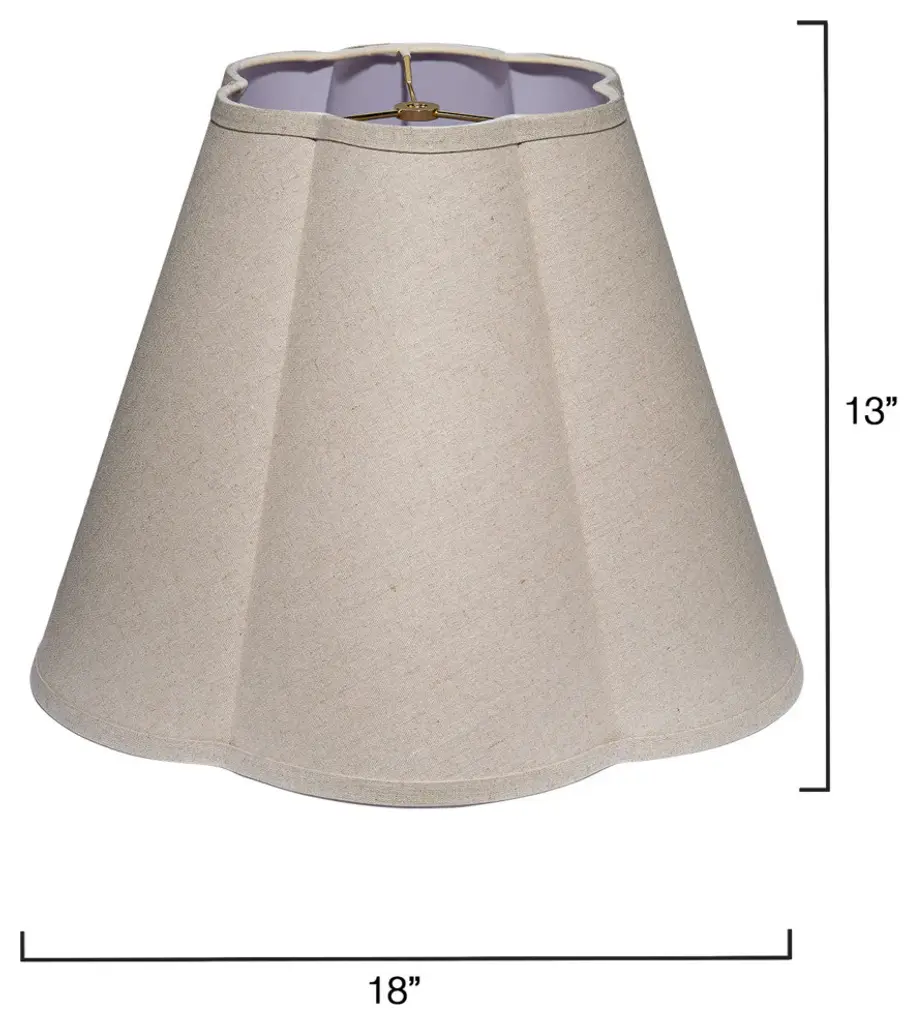 This lovely, tapered shade is distinguished by a softly scalloped shape that adds interest, femininity, and a generous splash of style. A skillfully crafted and hand-trimmed in linen, these unique shades are an exciting and easy way to update your decor. A gold-toned harp and a brass spider are included.Scalloped Cone, 100% Natural Linen, Trim EdgeIncludes Shade and Harp10.5" Gold Harp, Brass SpiderShade Dimensions: 13"H x 18"W x 18"D, Top Diameter 9" Not Damp RatedCare Instructions: We do not recommend using harsh or abrasive cleaners at any time as they can damage product. Wipe surfaces gently with soft, dry cloth. If needed, you may use a lightly damp cloth with water only on base.