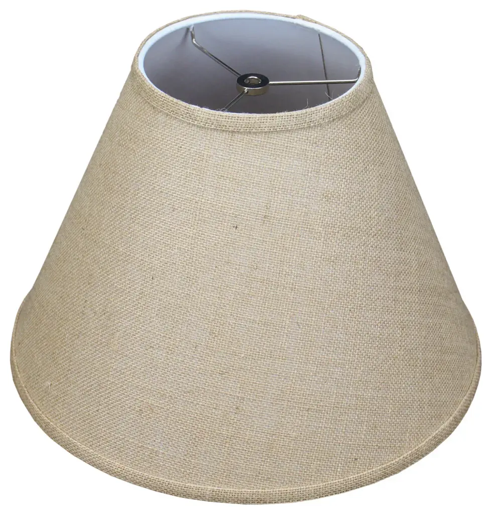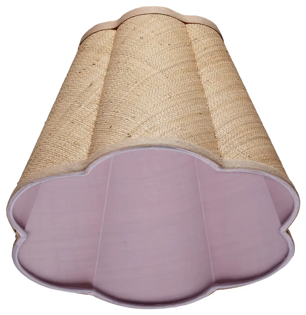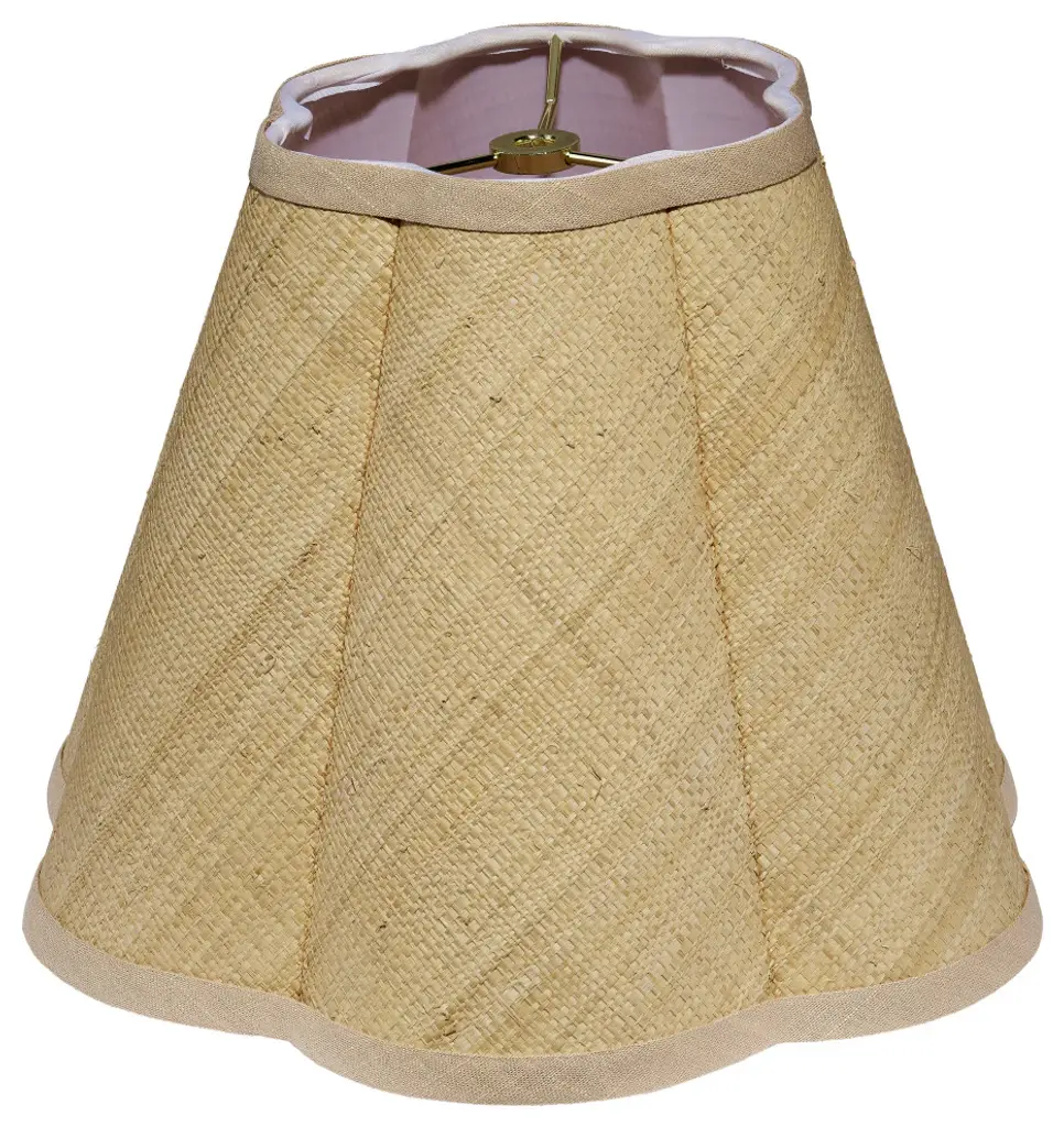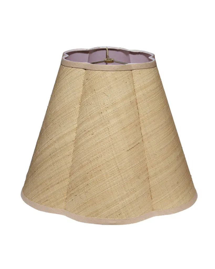 This lovely, tapered shade is distinguished by a softly scalloped shape that adds interest, femininity, and a generous splash of style. This skillfully crafted natural raffia shade is trimmed in linen. A brass-toned harp and a brass spider are included.Scalloped Cone, 100% Raffia, Trim EdgeIncludes Shade and Harp8" Gold Harp, Brass SpiderShade Dimensions: 9"H x 12"W x 12"D, Top Diameter 6" Not Damp RatedCare Instructions: We do not recommend using harsh or abrasive cleaners at any time as they can damage product. Wipe surfaces gently with soft, dry cloth. If needed, you may use a lightly damp cloth with water only on base.