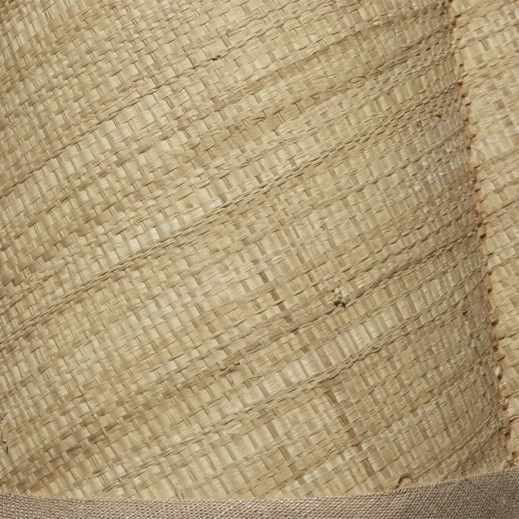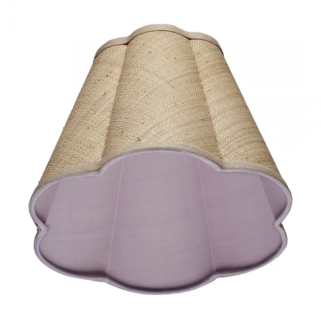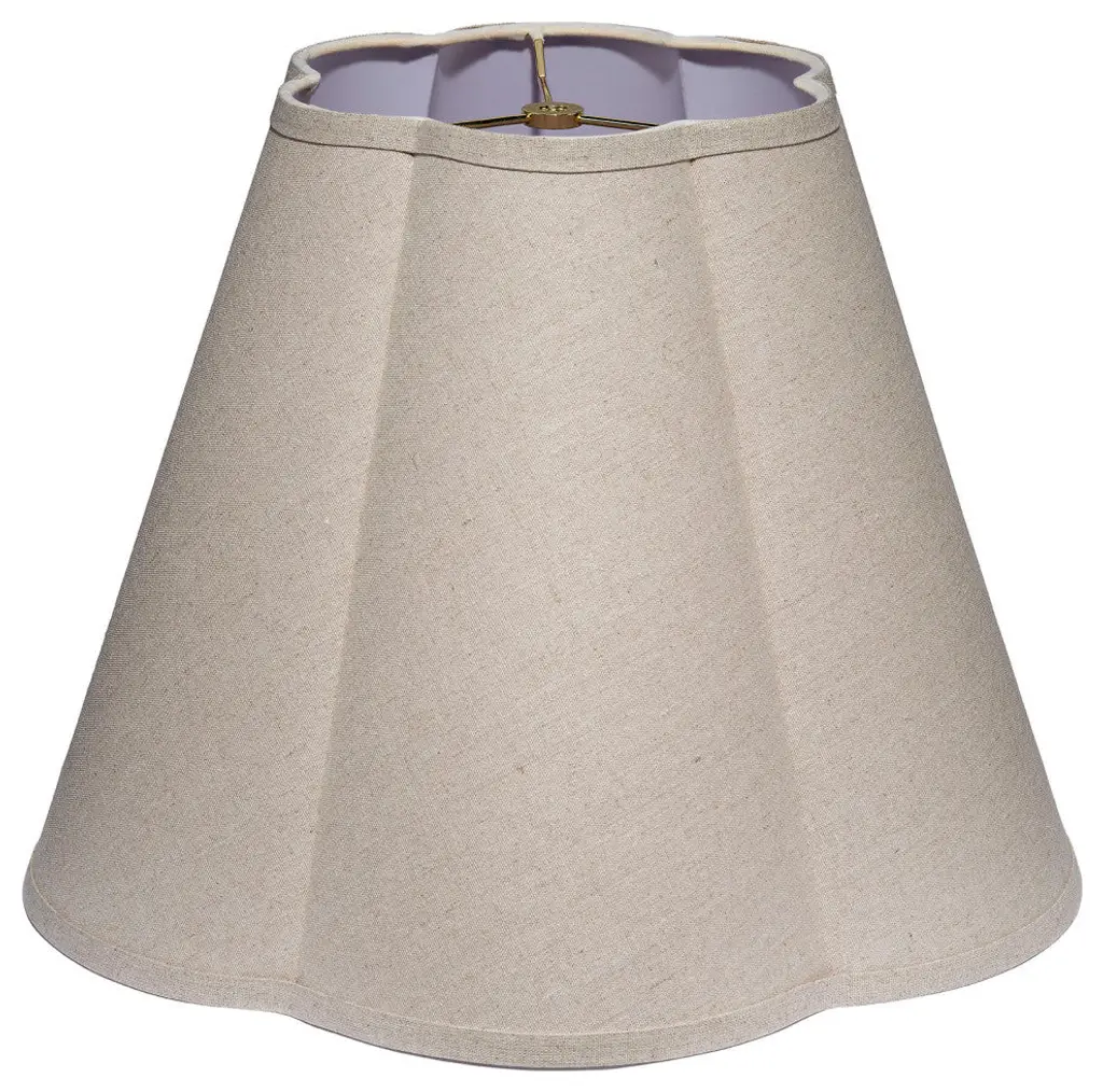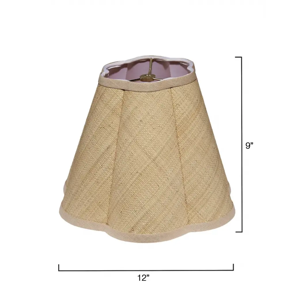 This lovely, tapered shade is distinguished by a softly scalloped shape that adds interest, femininity, and a generous splash of style. This skillfully crafted natural raffia shade is trimmed in linen. A brass-toned harp and a brass spider are included.
