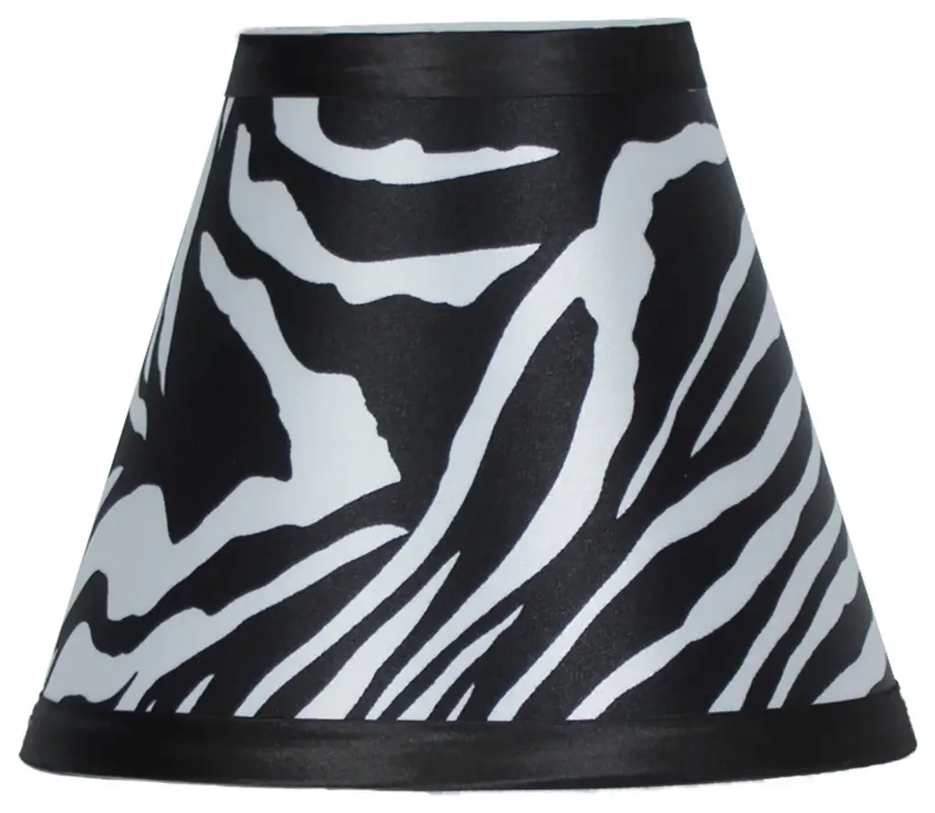 Urbanest hardback chandelier shade in zebra print.This shade measures 3" across the top, 6" across the bottom, and 4 1/2" slant height.Hardback empire shape. Clip-on for candleabra bulbs. Maximum recommended wattage is 25 watts. Lined in white.