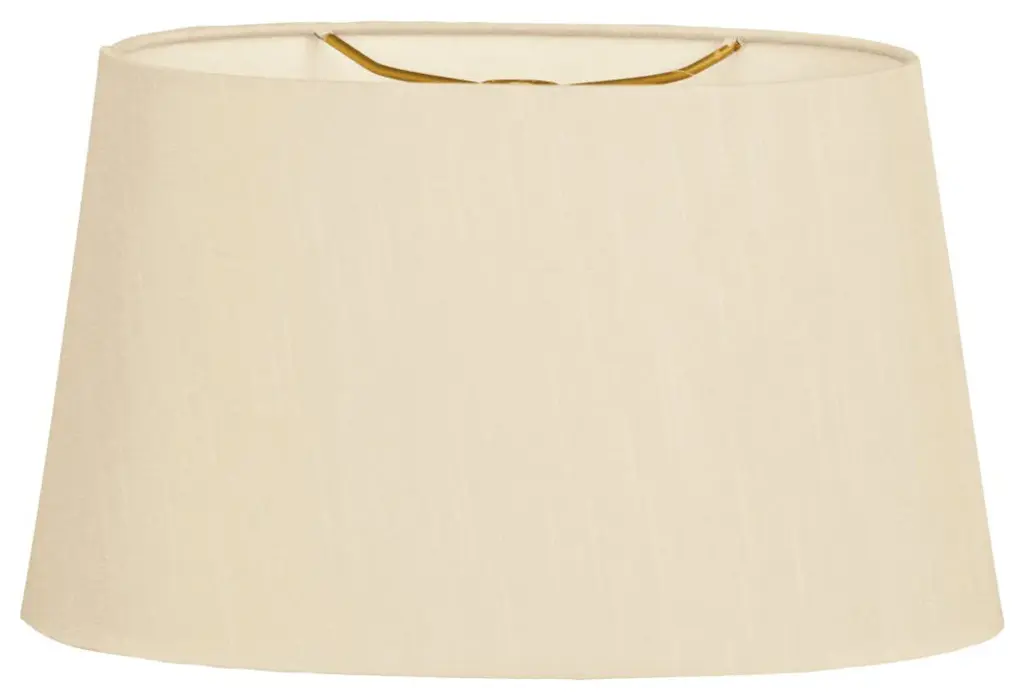 This Shallow Oval Hardback Lampshade - Beige 14 x 16 x 9 is a part of Royal Designs, Inc. Timeless Hardback Lampshade Collection and is perfect for anyone who is looking for a simple yet stunning lampshade. Royal Designs has been in the lampshade business since 1993 with their multiple shade lines that exemplify handcrafted quality and value.Exterior Fabric: Silk-Type Hardback ShantungInterior Fabric: Off-White Hardback LiningWasher: Standard brass-finish spider fitter, use a finial to fasten shade Trim: Fabric on top and bottom is rolled over the edgesFrame: Heavy grade rust resistant brass frameBulb: Suggested maximum wattage is 150-watt for most sizesHeight is measured by vertical height from top to bottom, not slant of the shade"