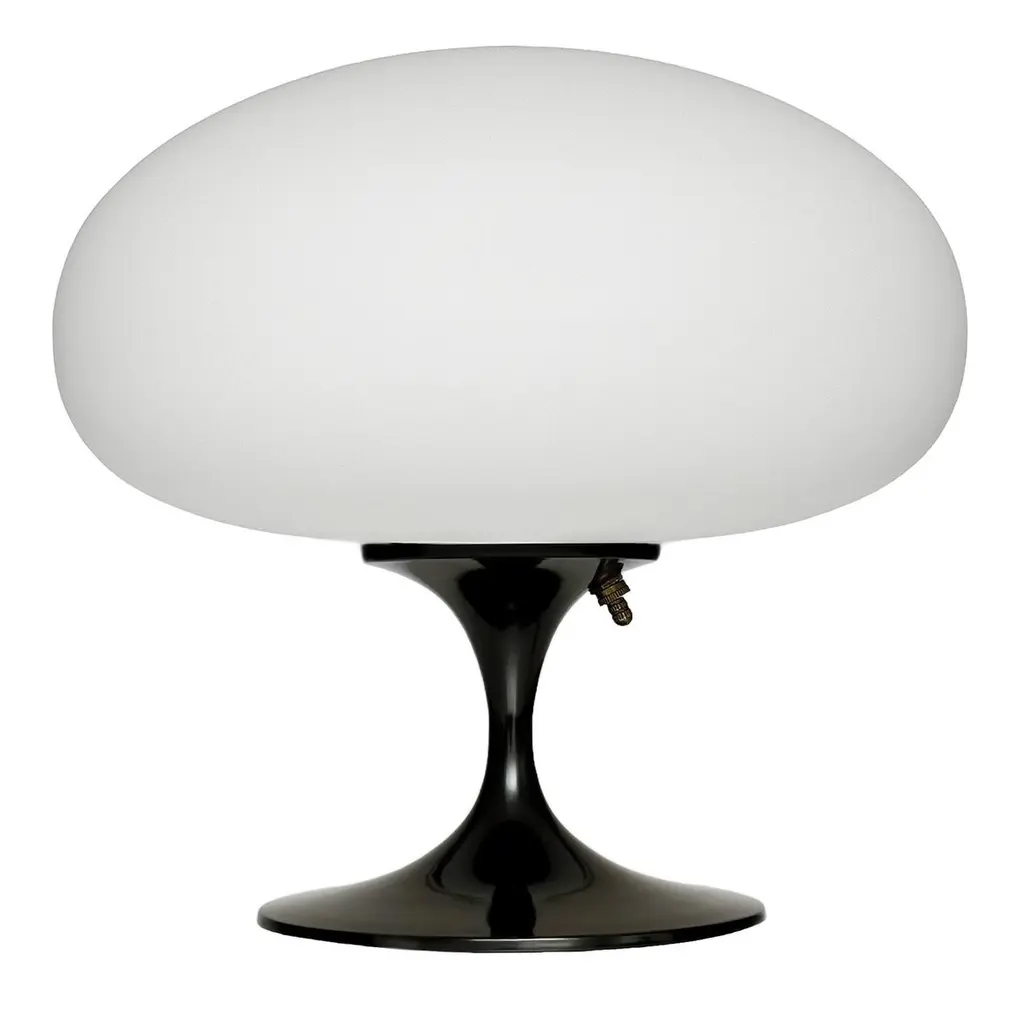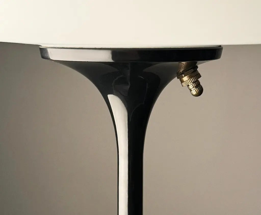 THIS ITEM IS ELIGIBLE FOR FREE SHIPPING!A sleek stemlite table lamp made by Design Line. It features a cast aluminum main base in a sculptural tulip form. The lamp base is finished in a black gloss color. The frosted glass lamp shade is hand blown and gives off a soft warm filtered light. It works with one standard bulb up to 100 watts and plugs into a standard US outlet.These retro lamps work with all mid-century modern furniture & decor. Such as classic vintage mcm, art deco, space age, post modern, retro kitsch and contemporary design. Imagine a pair of these lamps used as bedside lamps, on end tables in a living room, or a matching pair on top of a vintage credenza. These lamps will compliment modern furniture from iconic designers like Charles Eames, Eero Saarinen, Harry Bertoia, Paul McCobb, Adrian Pearsall, Verner Panton, Florence Knoll, Joe Columbo, Hans Wegner & Arne Jacobsen. Use a single lamp as an accent lamp on your favorite cabinet or buy one as a funky desk lamp. These are sure to go with modern furniture manufacturers from the past and present. Confidently mix these lamps that fit with brands like Herman Miller, Knoll, Fritz Hansen, Kartell, Artemide, Planner Group, Niels Moller, Maurice Villency, and Thayer Coggin. If you have any question, please don't hesitate to message us.