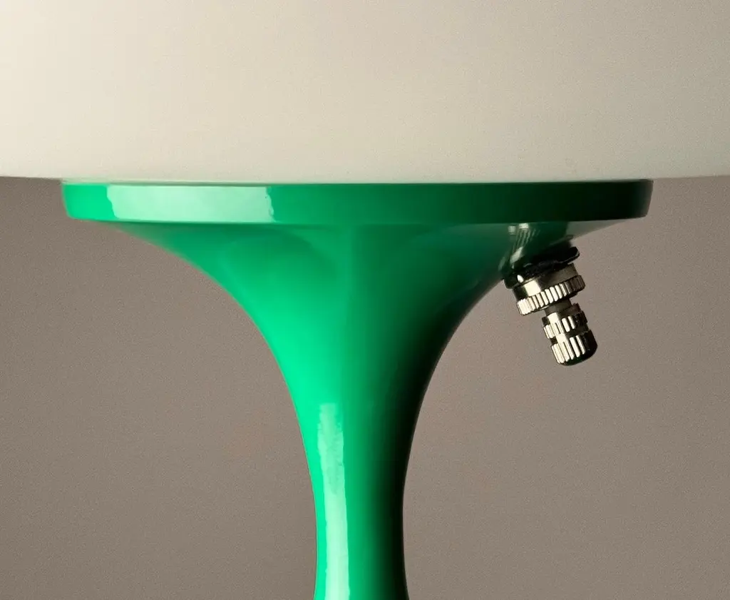THIS ITEM IS ELIGIBLE FOR FREE SHIPPING!A sleek stemlite table lamp made by Design Line. It features a cast aluminum main base in a sculptural tulip form. The lamp base is finished in a classic retro green. The frosted glass lamp shade is hand blown and gives off a soft warm filtered light. It works with one standard bulb up to 100 watts and plugs into a standard US outlet.These retro lamps work with all mid-century modern furniture & decor. Such as classic vintage mcm, art deco, space age, post modern, retro kitsch and contemporary design. Imagine a pair of these lamps used as bedside lamps, on end tables in a living room, or a matching pair on top of a vintage credenza. These lamps will compliment modern furniture from iconic designers like Charles Eames, Eero Saarinen, Harry Bertoia, Paul McCobb, Adrian Pearsall, Verner Panton, Florence Knoll, Joe Columbo, Hans Wegner & Arne Jacobsen. Use a single lamp as an accent lamp on your favorite cabinet or buy one as a funky desk lamp. These are sure to go with modern furniture manufacturers from the past and present. Confidently mix these lamps that fit with brands like Herman Miller, Knoll, Fritz Hansen, Kartell, Artemide, Planner Group, Niels Moller, Maurice Villency, and Thayer Coggin. If you have any question, please don't hesitate to message us.