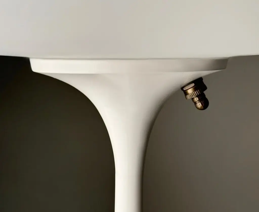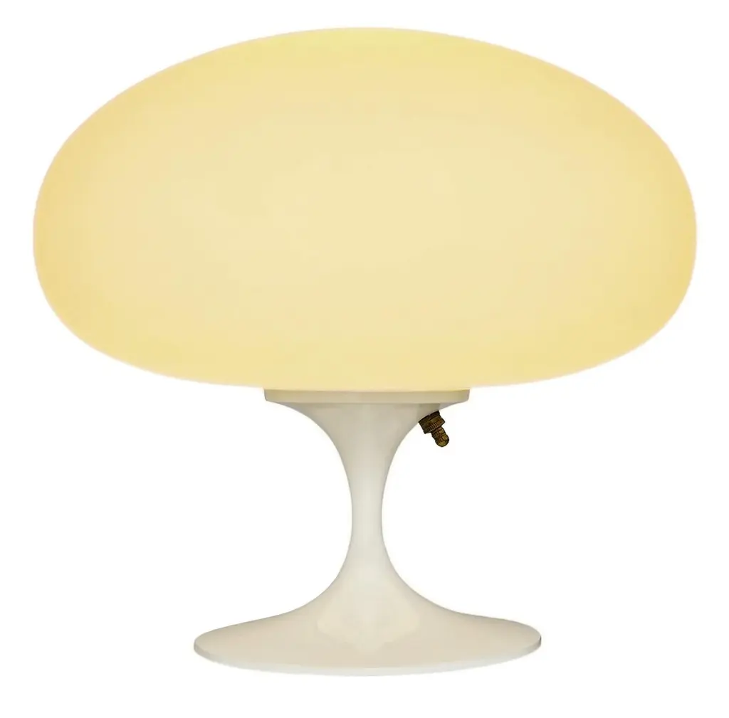 THIS ITEM IS ELIGIBLE FOR FREE SHIPPING!A sleek stemlite table lamp made by Design Line. It features a cast aluminum main base in a sculptural tulip form. The lamp base is finished in high gloss white. The frosted glass lamp shade is hand blown and gives off a soft warm filtered light. It works with one standard bulb up to 100 watts and plugs into a standard US outlet.These retro lamps work with all mid-century modern furniture & decor. Such as classic vintage mcm, art deco, space age, post modern, retro kitsch and contemporary design. Imagine a pair of these lamps used as bedside lamps, on end tables in a living room, or a matching pair on top of a vintage credenza. These lamps will compliment modern furniture from iconic designers like Charles Eames, Eero Saarinen, Harry Bertoia, Paul McCobb, Adrian Pearsall, Verner Panton, Florence Knoll, Joe Columbo, Hans Wegner & Arne Jacobsen. Use a single lamp as an accent lamp on your favorite cabinet or buy one as a funky desk lamp. These are sure to go with modern furniture manufacturers from the past and present. Confidently mix these lamps that fit with brands like Herman Miller, Knoll, Fritz Hansen, Kartell, Artemide, Planner Group, Niels Moller, Maurice Villency, and Thayer Coggin. If you have any question, please don't hesitate to message us.