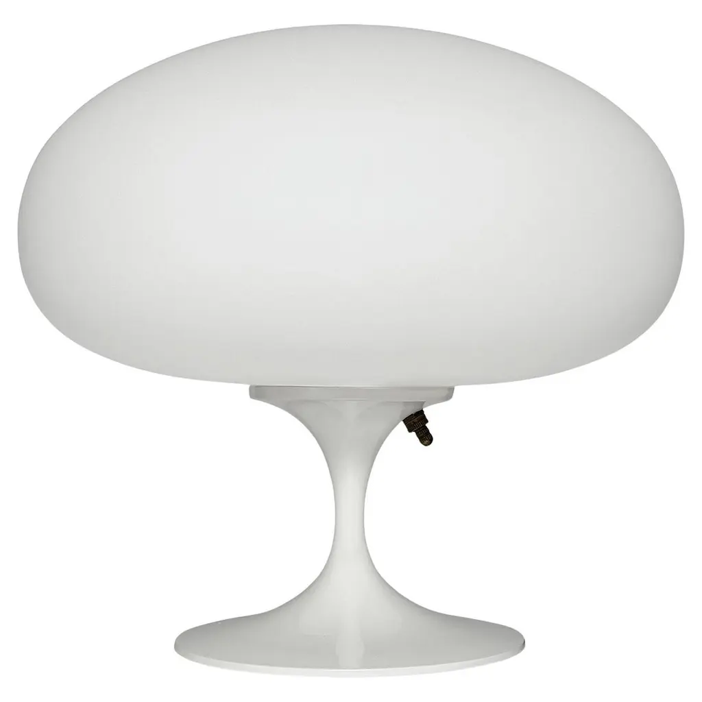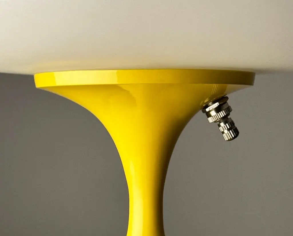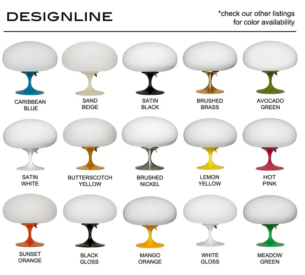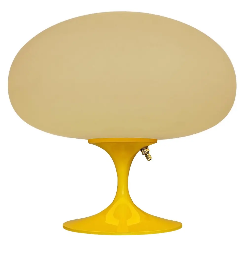 THIS ITEM IS ELIGIBLE FOR FREE SHIPPING!A sleek stemlite table lamp made by Design Line. It features a cast aluminum main base in a sculptural tulip form. The lamp base is finished in a classic bright lemon yellow color. The frosted glass lamp shade is hand blown and gives off a soft warm filtered light. It works with one standard bulb up to 100 watts and plugs into a standard US outlet.These retro lamps work with all mid-century modern furniture & decor. Such as classic vintage mcm, art deco, space age, post modern, retro kitsch and contemporary design. Imagine a pair of these lamps used as bedside lamps, on end tables in a living room, or a matching pair on top of a vintage credenza. These lamps will compliment modern furniture from iconic designers like Charles Eames, Eero Saarinen, Harry Bertoia, Paul McCobb, Adrian Pearsall, Verner Panton, Florence Knoll, Joe Columbo, Hans Wegner & Arne Jacobsen. Use a single lamp as an accent lamp on your favorite cabinet or buy one as a funky desk lamp. These are sure to go with modern furniture manufacturers from the past and present. Confidently mix these lamps that fit with brands like Herman Miller, Knoll, Fritz Hansen, Kartell, Artemide, Planner Group, Niels Moller, Maurice Villency, and Thayer Coggin. If you have any question, please don't hesitate to message us.