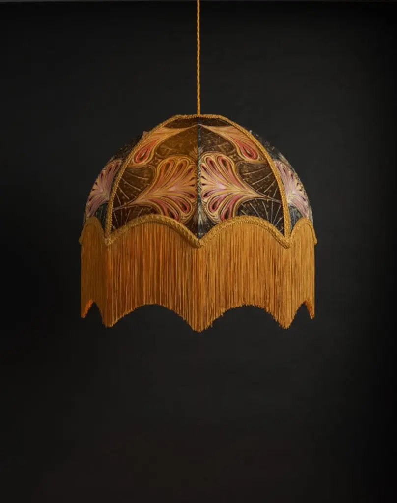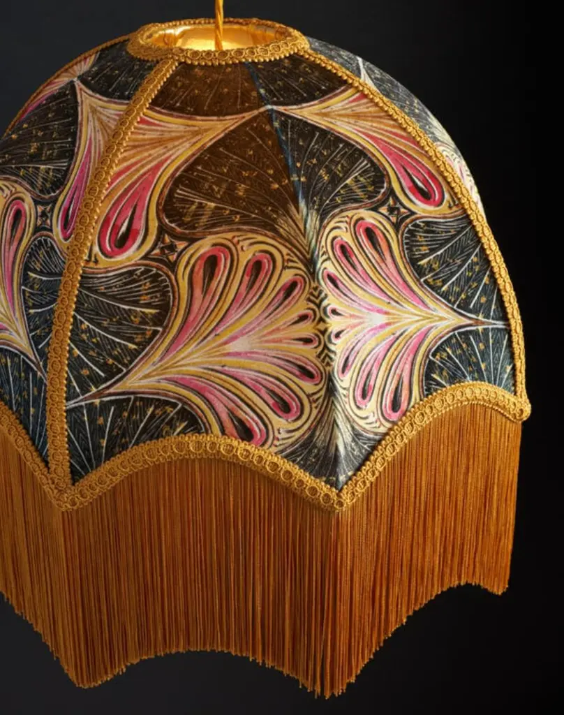 Showgirl is a glamorous fan-like design, produced using cut and painted lino which creates the depth in this pattern of Anna’s, in tones of black, gold and vivid pink.Anna Hayman lampshades create a fantastic centrepiece to a room and work as well on a lamp base as they do as pendants, especially now we are able to offer gold linings. Treat yourself to a beautiful piece of artistry, all made in the UK.Every piece is handmade to order and takes 5-7 weeks to be made and delivered. A piece for your interior to treasure and delight in, these emit a soft glow which lights up a room so beautifully.The Duchess satin lets more light through than the velvet, as does the white lining rather than the gold. You can use a higher wattage/lumen strength bulb if you’d like the heavier velvet fabric.The dimensions are below – please bear in mind fringe colour/length is able to be altered easily as is the braid trim. Do email us for alternative options.Frame Diameter: 18"Frame Height: 10.5"Fringe Length: 8"Flex and fitting are not included.The attachment for your lamp or pendant fitting is included – choice of lamp or hanging pendant attachment, these are both adjustable for UK or Euro (E27) fittings, as well as US E26. Email us if you’d like further information on this.
