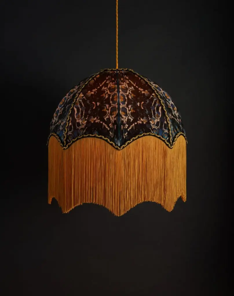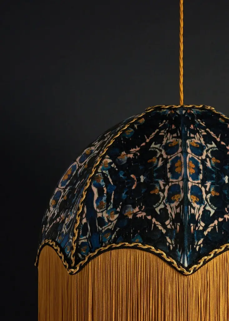 Siouxsie, named after the legend Siouxsie Sioux, is our punky print with a distinct rebellious streak. It was created by layering two of Anna’s designs up together (Pearl and Giraffe) and comes together in dark shades of petrol with highlights of gold, pink and yellow.Anna Hayman lampshades create a fantastic centrepiece to a room and work as well on a lamp base as they do as pendants, especially now we are able to offer gold linings. Treat yourself to a beautiful piece of artistry, all made in the UK.Every piece is handmade to order and takes 5-7 weeks to be made and delivered. A piece for your interior to treasure and delight in, these emit a soft glow which lights up a room so beautifully.The Duchess satin lets more light through than the velvet, as does the white lining rather than the gold. You can use a higher wattage/lumen strength bulb if you’d like the heavier velvet fabric.The dimensions are below – please bear in mind fringe colour/length is able to be altered easily as is the braid trim. Do email us for alternative options.Frame Diameter: 16"Frame Height: 9.5"Fringe Length if Pendant Fitting: 8"Fringe Length if Lamp Base Fitting: 6"Flex and fitting are not included.The attachment for your lamp or pendant fitting is included – choice of lamp or hanging pendant attachment, these are both adjustable for UK or Euro (E27) fittings, as well as US E26. Email us if you’d like further information on this.