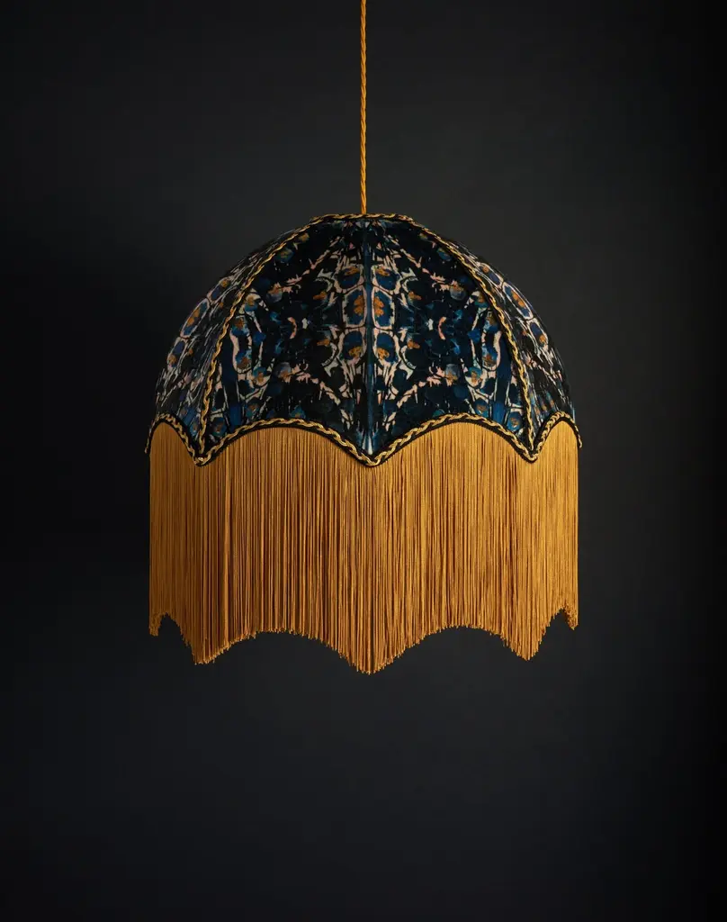 Siouxsie, named after the legend Siouxsie Sioux, is our punky print with a distinct rebellious streak. It was created by layering two of Anna’s designs up together (Pearl and Giraffe) and comes together in dark shades of petrol with highlights of gold, pink and yellow.Anna Hayman lampshades create a fantastic centrepiece to a room and work as well on a lamp base as they do as pendants, especially now we are able to offer gold linings. Treat yourself to a beautiful piece of artistry, all made in the UK.Every piece is handmade to order and takes 5-7 weeks to be made and delivered. A piece for your interior to treasure and delight in, these emit a soft glow which lights up a room so beautifully.The Duchess satin lets more light through than the velvet, as does the white lining rather than the gold. You can use a higher wattage/lumen strength bulb if you’d like the heavier velvet fabric.The dimensions are below – please bear in mind fringe colour/length is able to be altered easily as is the braid trim. Do email us for alternative options.Frame Diameter: 14"Frame Height: 6"Fringe Length: 6"Flex and fitting are not included.The attachment for your lamp or pendant fitting is included – choice of lamp or hanging pendant attachment, these are both adjustable for UK or Euro (E27) fittings, as well as US E26. Email us if you’d like further information on this.