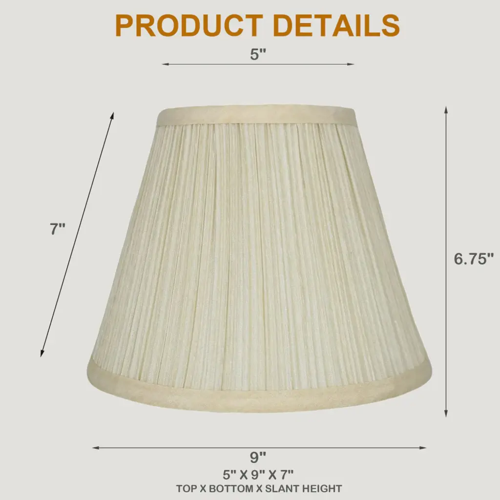 Urbanest mushroom pleated lampshadeFaux silk softback shade with brushed nickel spider fitter. Shade is cream faux silk with white lining.Top diameter measures 5" across, bottom diameter measures 9" across and 7" slant height.Maximum recommended wattage is 60 watts. Bulb not included.List price is for 2 shades.