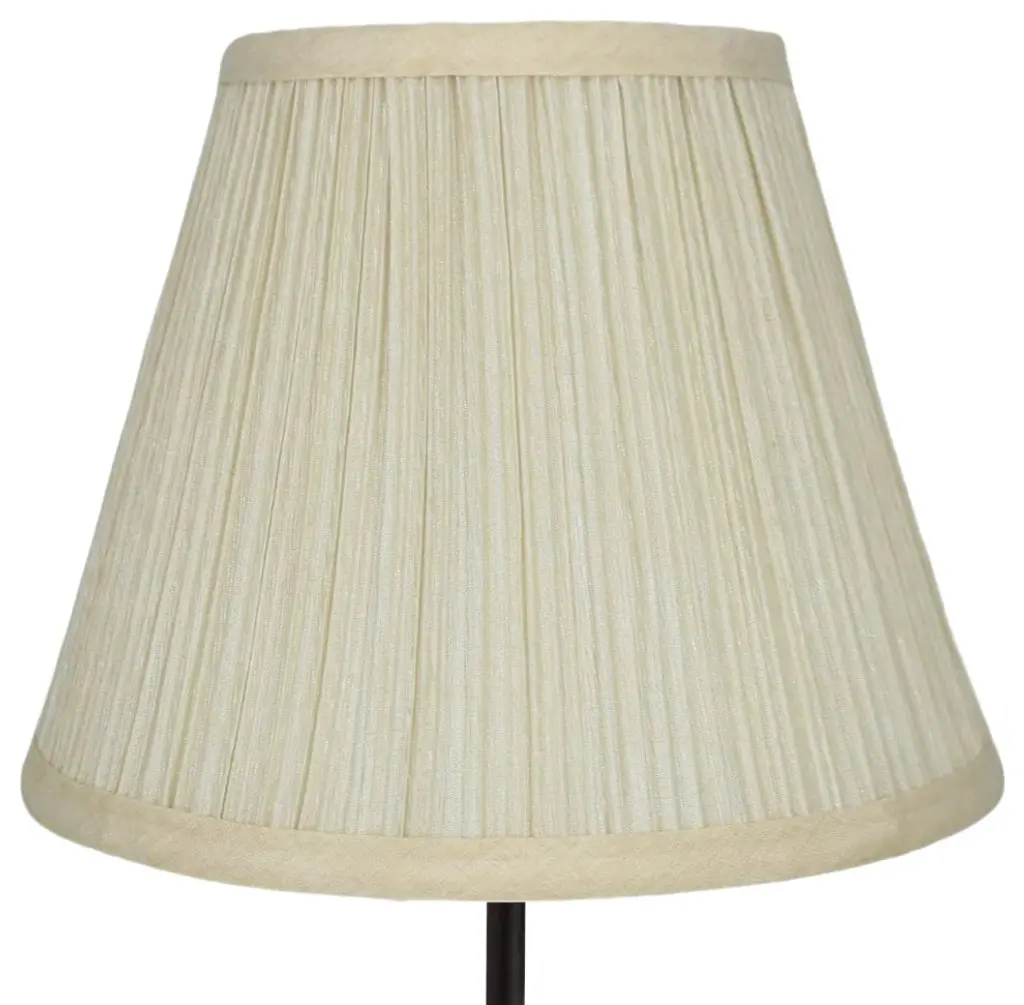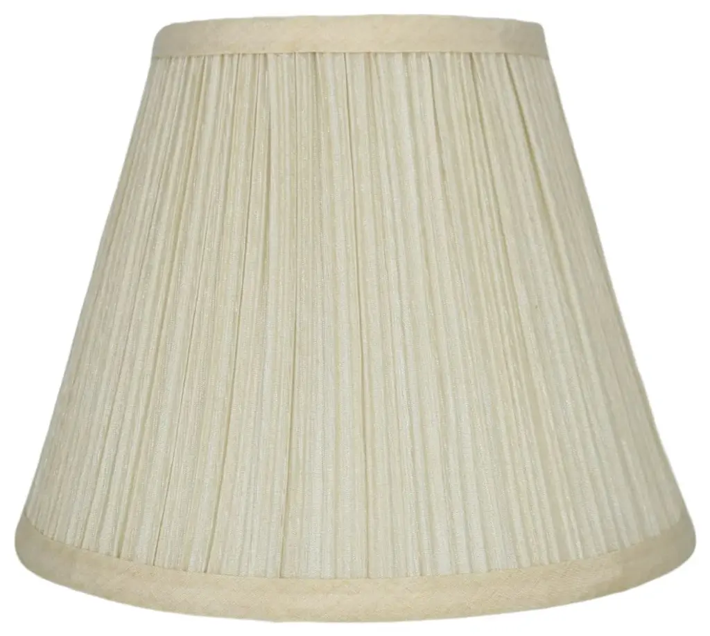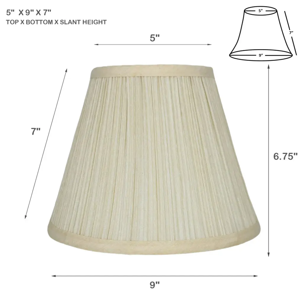 Urbanest mushroom pleated lampshadeFaux silk softback shade with brushed nickel spider fitter. Shade is cream faux silk with white lining.Top diameter measures 5" across, bottom diameter measures 9" across and 7" slant height.Maximum recommended wattage is 60 watts. Bulb not included.List price is for 1 shade.