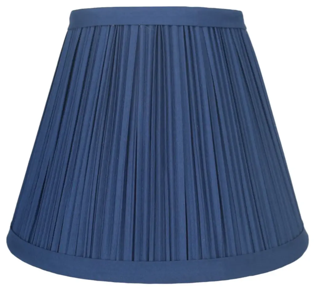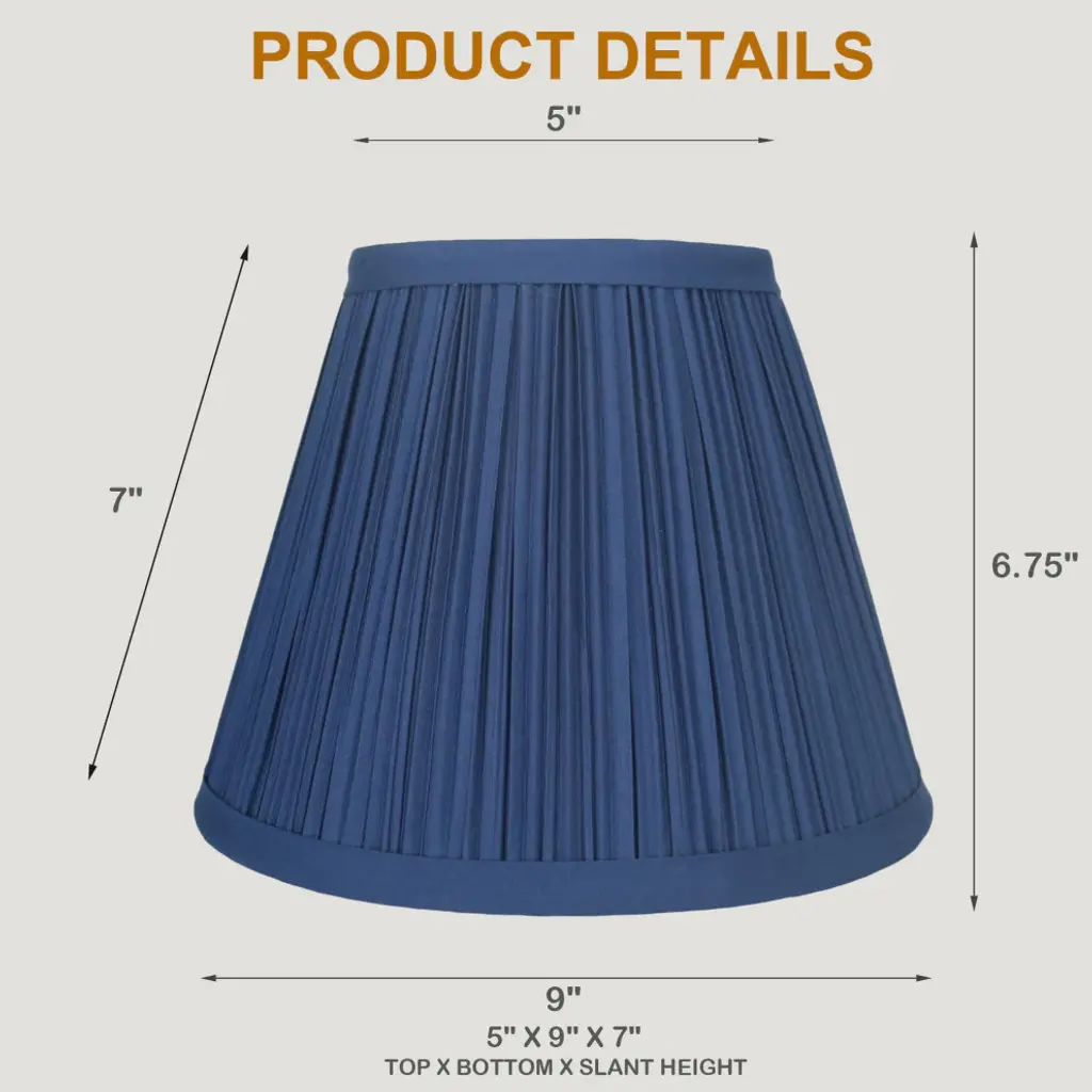 Urbanest mushroom pleated lampshadeFaux silk bell with a spider fitter. Shade is navy blue faux silk with white lining.Top diameter measures 5" across, bottom diameter measures 9" across and 7" slant height.Maximum recommended wattage is 60 watts. Bulb not included.List price is for 1 shade.