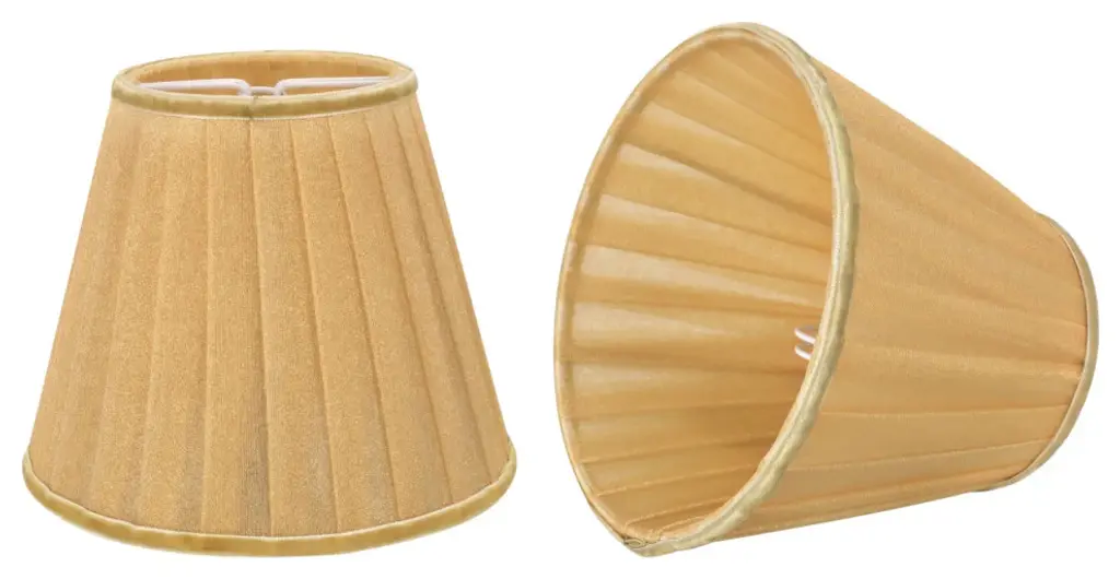 Urbanest mushroom pleated lampshadesFaux silk softback shade with brushed nickel spider fitter. Shade is tan faux silk with white lining.Top diameter measures 5" across, bottom diameter measures 9" across and 7" slant height.Maximum recommended wattage is 60 watts. Bulb not included.List price is for 2 shades.