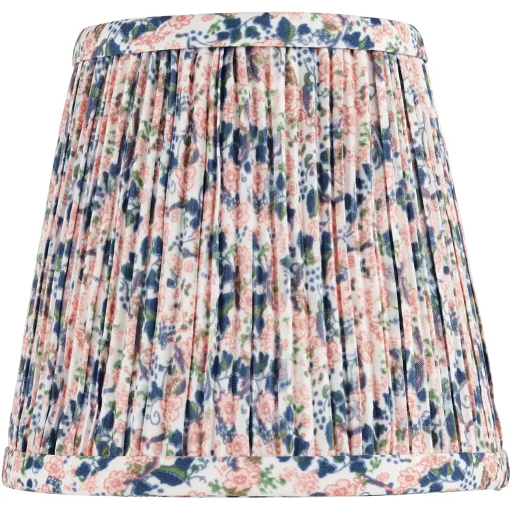 Brighten the look of a chandelier or lamp with this set of 6 clip-on lamp shades from the Springcrest brand. The shades have a tight shirred pleat using a blue and pink floral leaf patterned fabric. The decorative leaf pattern is set against an off-white cream color background, and the shade has a white polystyrene liner. The metal clip fitter is in a polished brass finish.