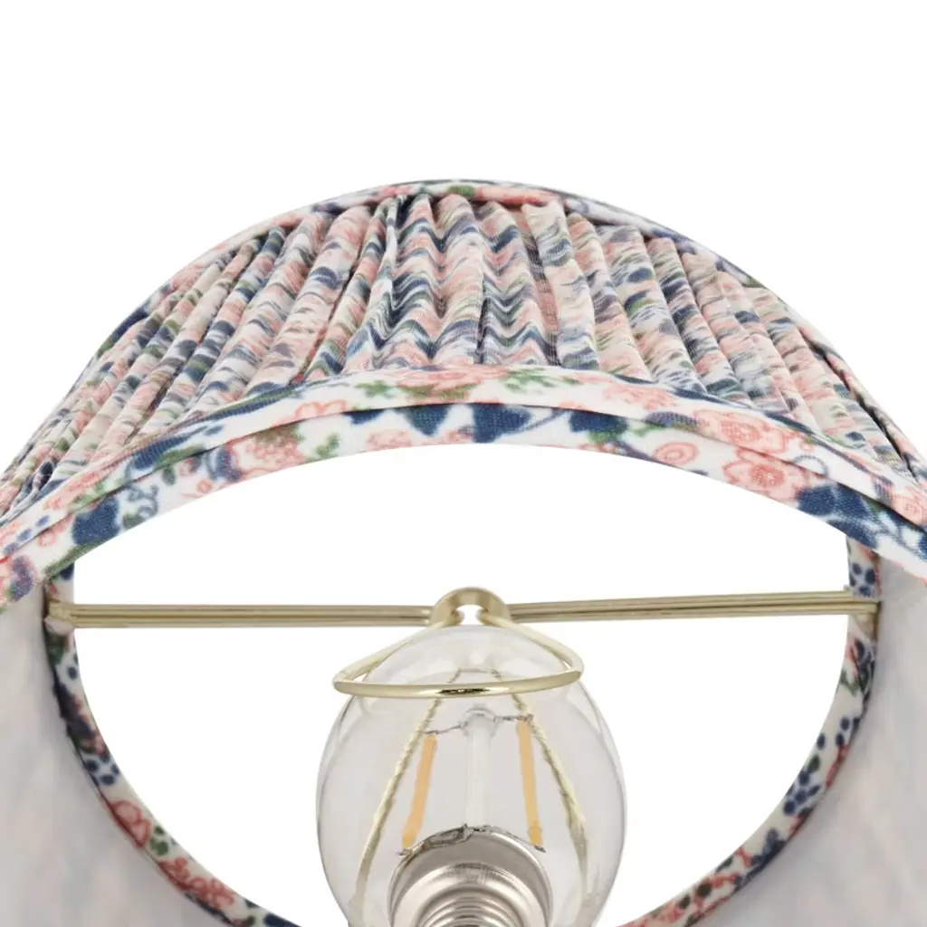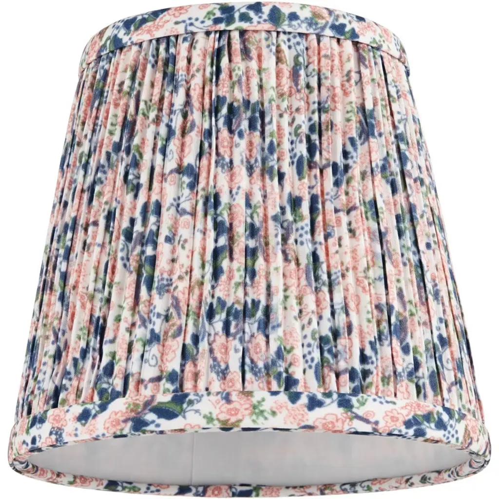 Brighten the look of a chandelier or lamp with this set of 4 clip-on lamp shades from the Springcrest brand. The shades have a tight shirred pleat using a blue and pink floral leaf patterned fabric. The decorative leaf pattern is set against an off-white cream color background, and the shade has a white polystyrene liner. The metal clip fitter is in a polished brass finish.