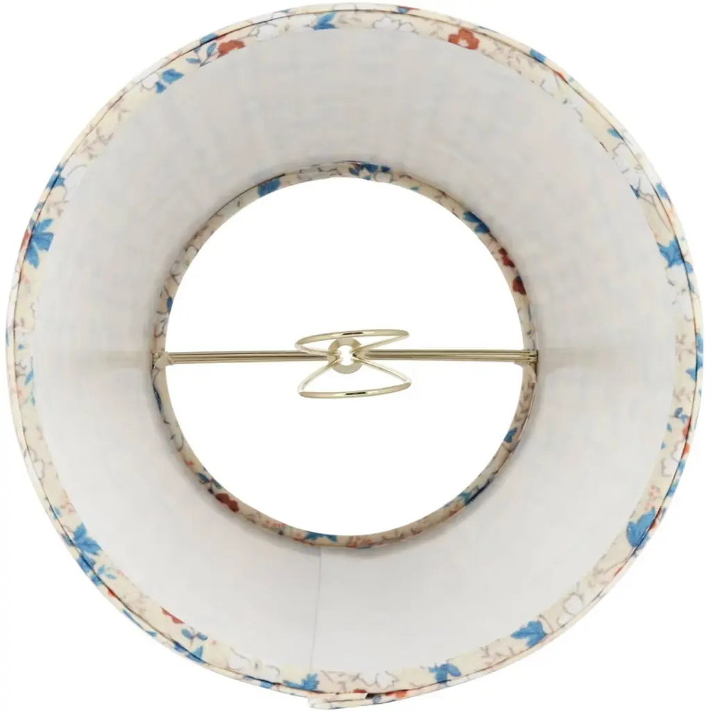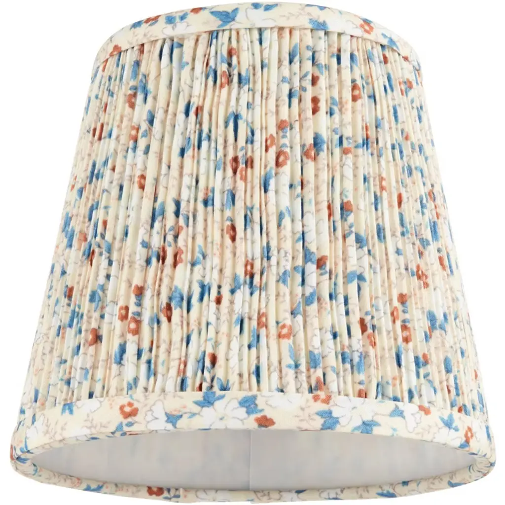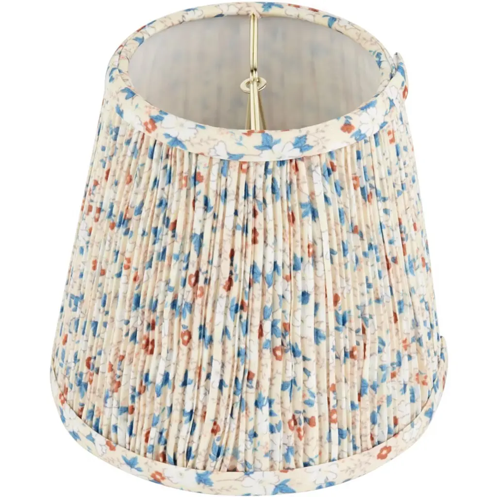 Brighten the look of a fixture or lamp with this set of 6 clip-on lamp shades from the Springcrest brand. The shades have a tight shirred pleat using a blue and red leaf patterned fabric. The decorative leaf pattern is set against an off-white cream color background, and the shade has a white polystyrene liner. The metal clip fitter is in a polished brass finish.