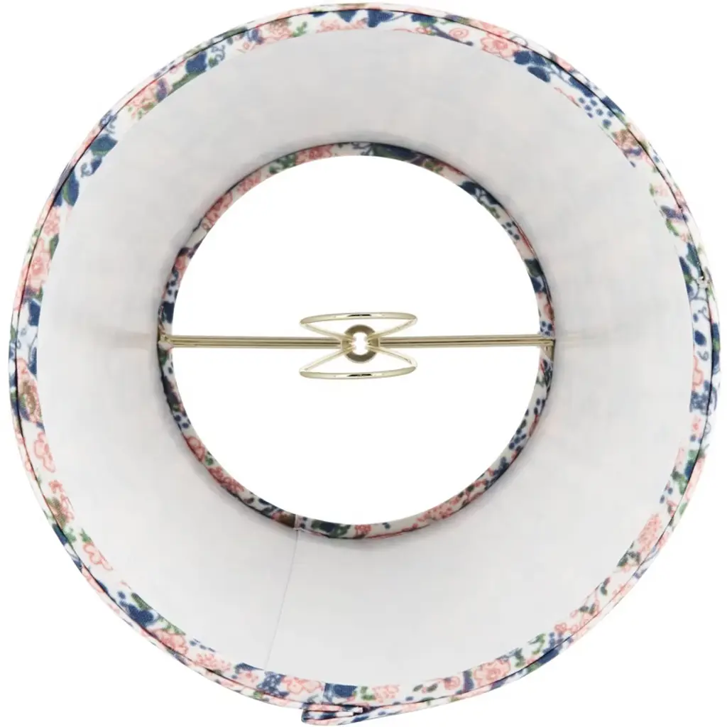 Brighten the look of a chandelier or lamp with this set of 8 clip-on lamp shades from the Springcrest brand. The shades have a tight shirred pleat using a blue and pink floral leaf patterned fabric. The decorative leaf pattern is set against an off-white cream color background, and the shade has a white polystyrene liner. The metal clip fitter is in a polished brass finish.