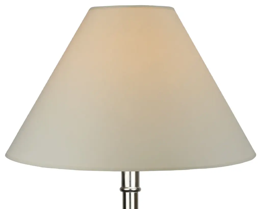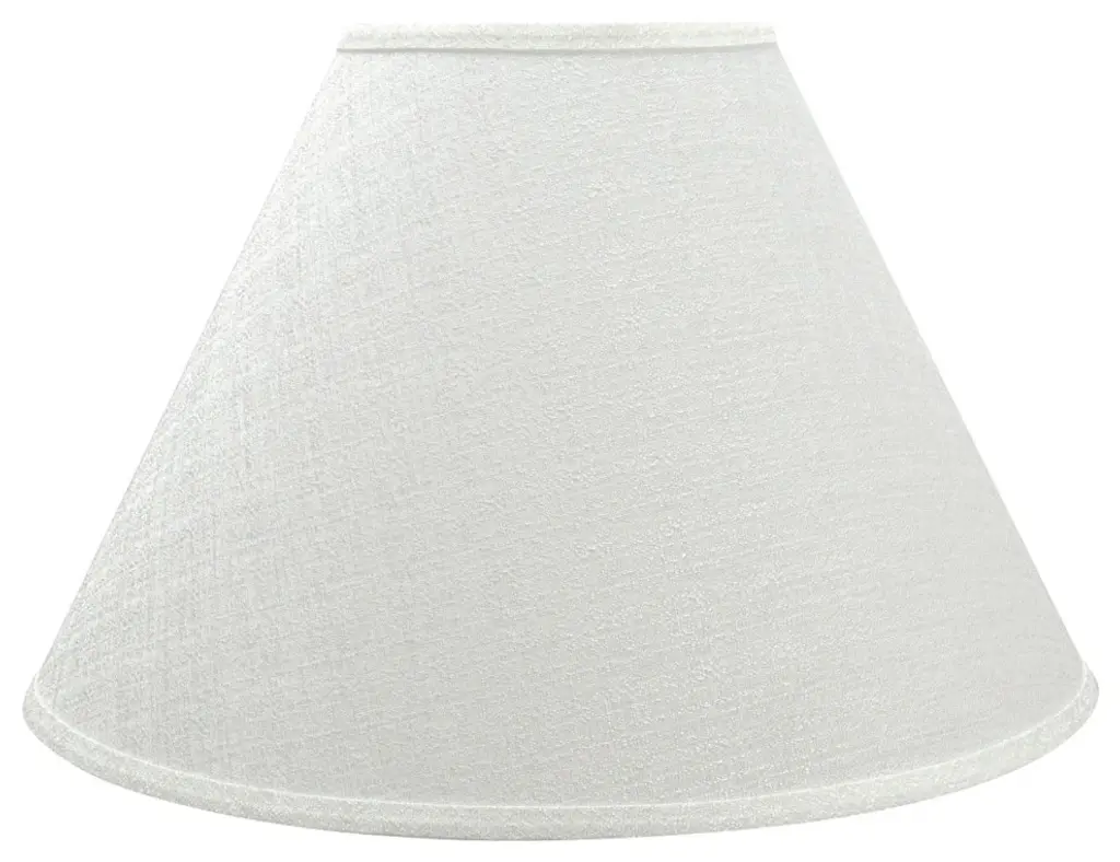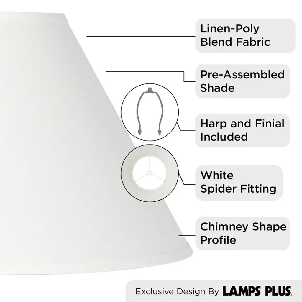 A white lamp shade in a dramatic chimney shape. The fabric is a linen and poly blend. The white finish spider fitting provides a dash of glam. From the Springcrest Collection brand of lamp shades.