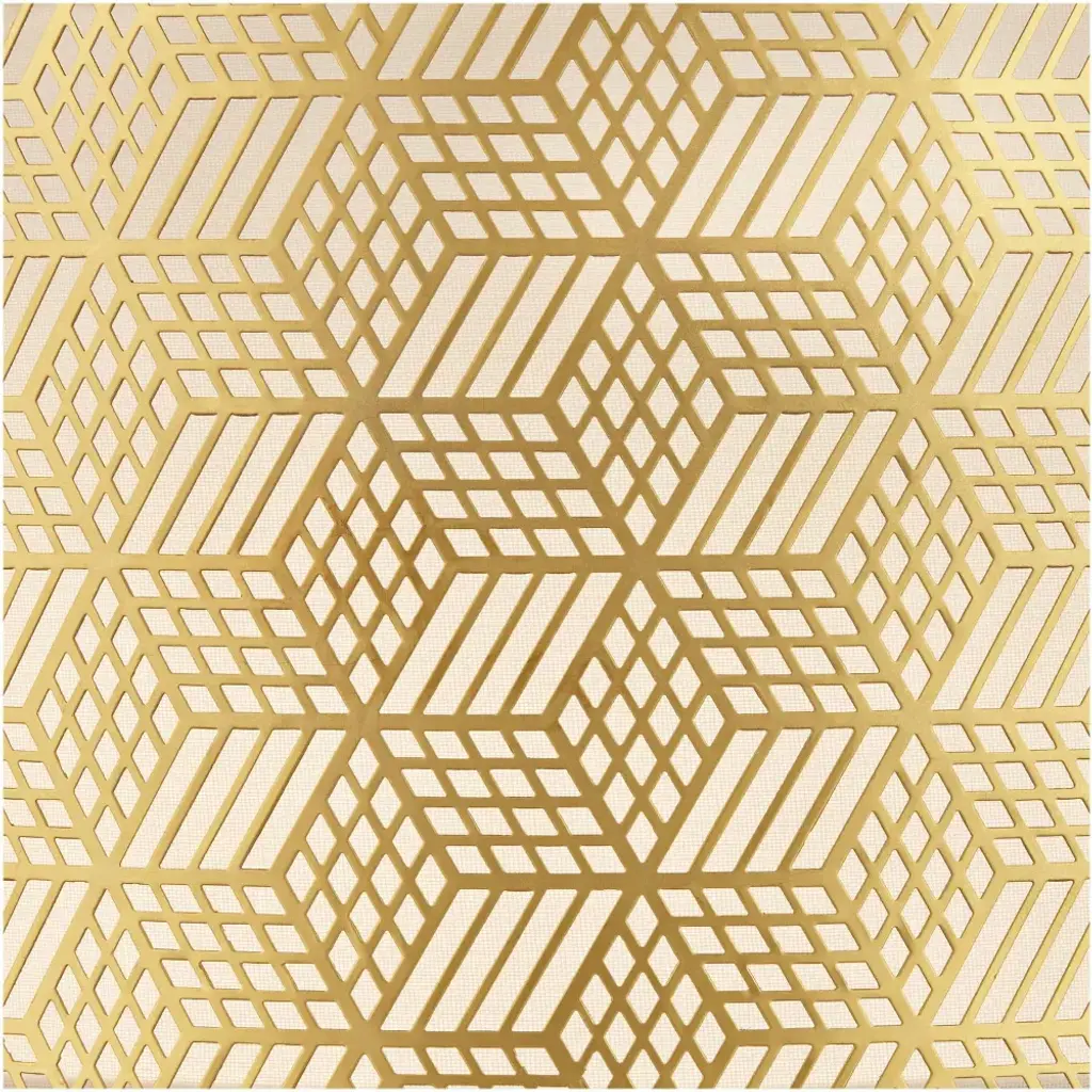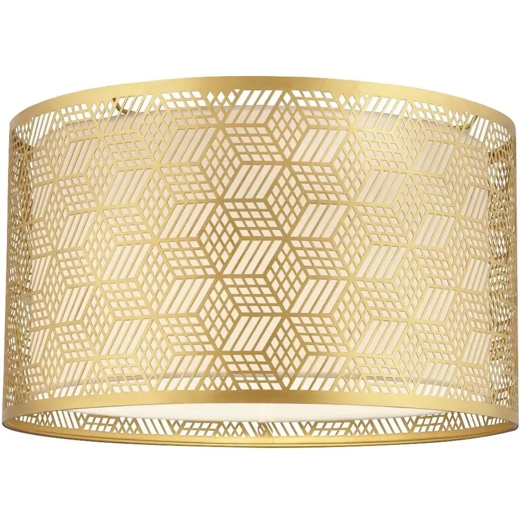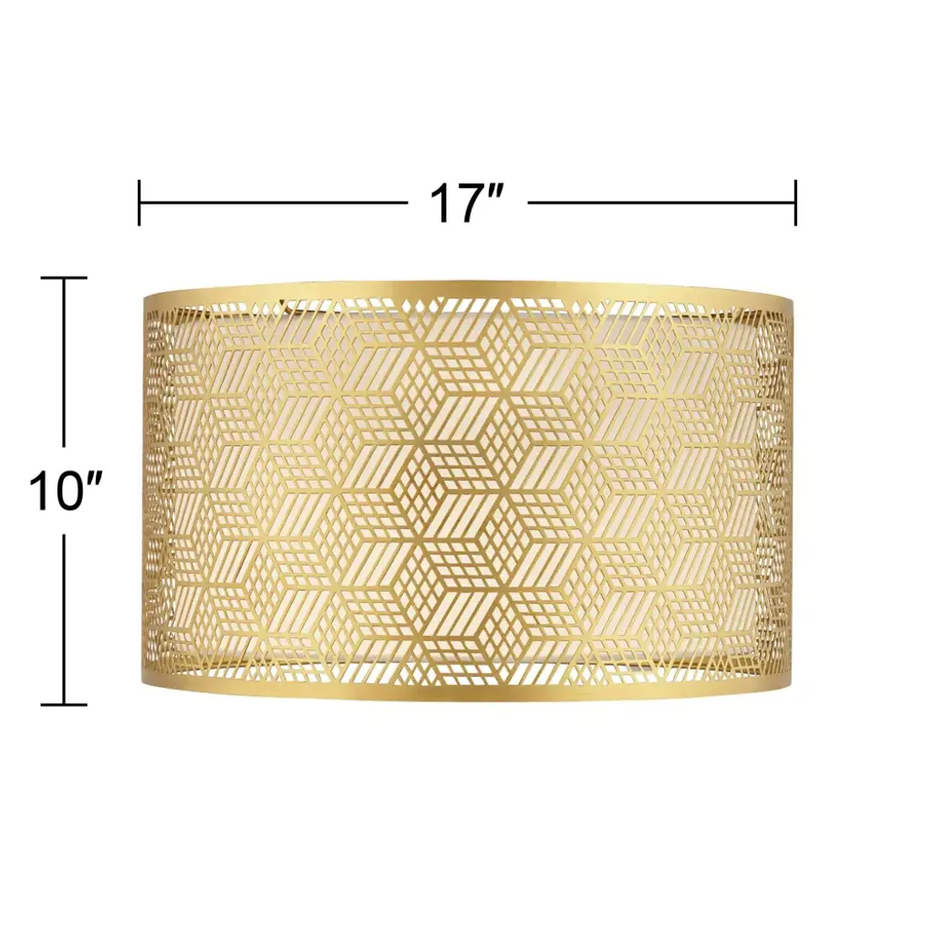 This metal drum shade features a geometric laser-cut pattern that gives this design a mesh look. A gold finish adds a rich and lovely effect that makes this shade perfect for contemporary and glam-luxe style settings. Inside is a layer of white lining for shielding against the glare of lighting.