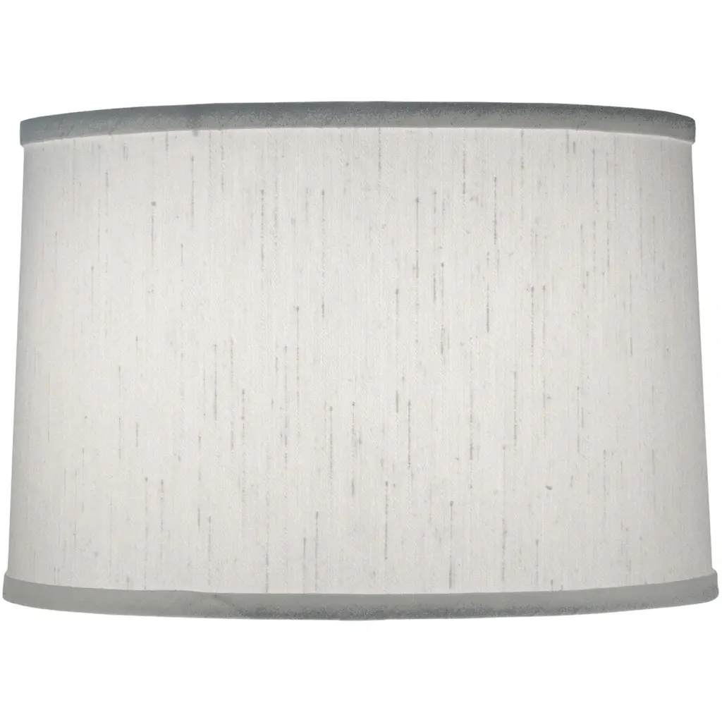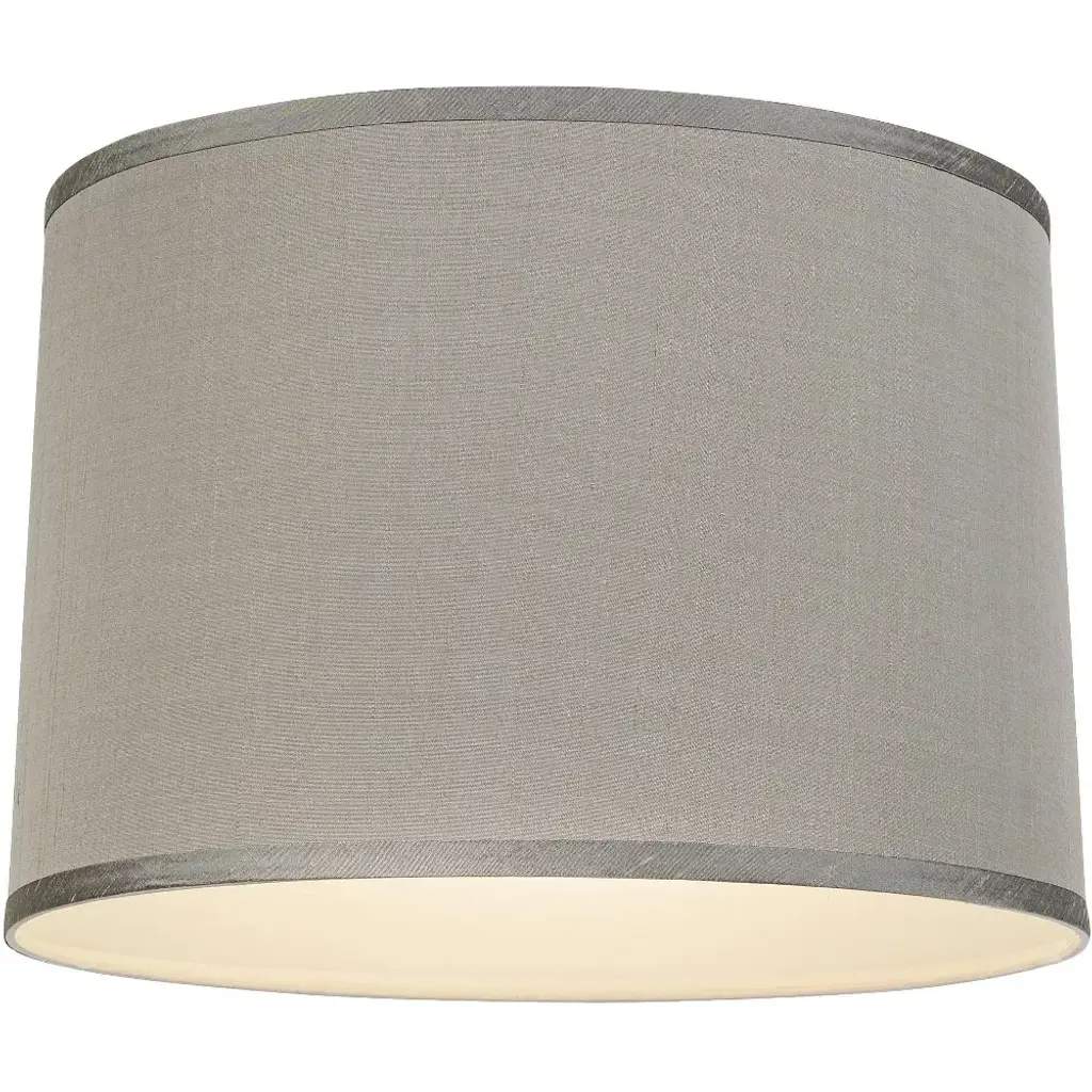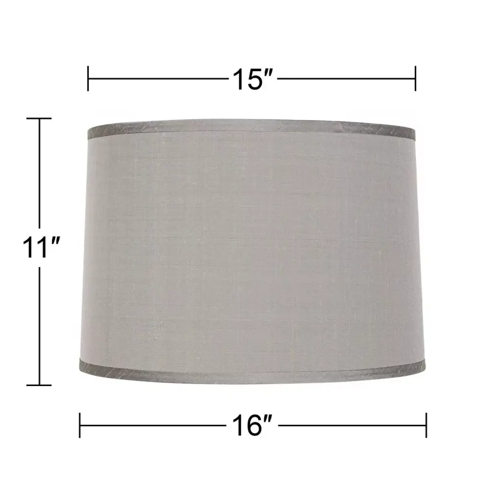 Cool and sophisticated, this modern drum shade offers sleek style update for your favorite lamp. It comes in a platinum grey faux silk fabric and has a slightly darker gray tone trim top and bottom. This shade has a spider fitting and is an unlined, hardback style. From the Springcrest Collection brand of lamp shades. The correct size harp and a finial are included free with this shade.
