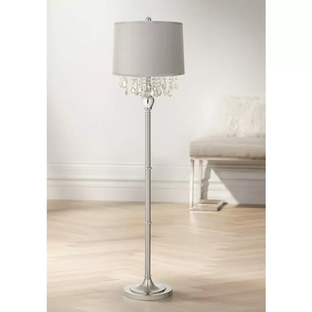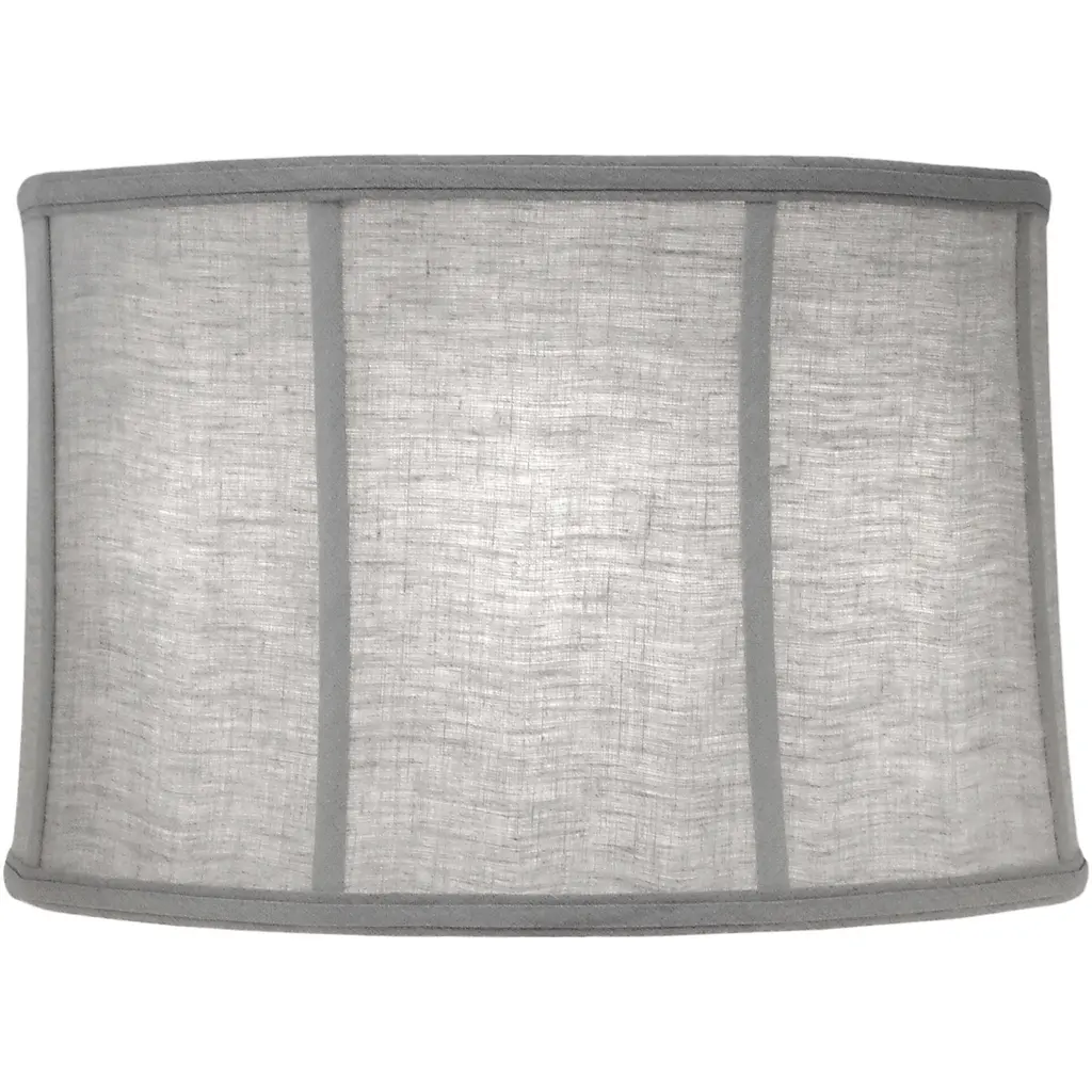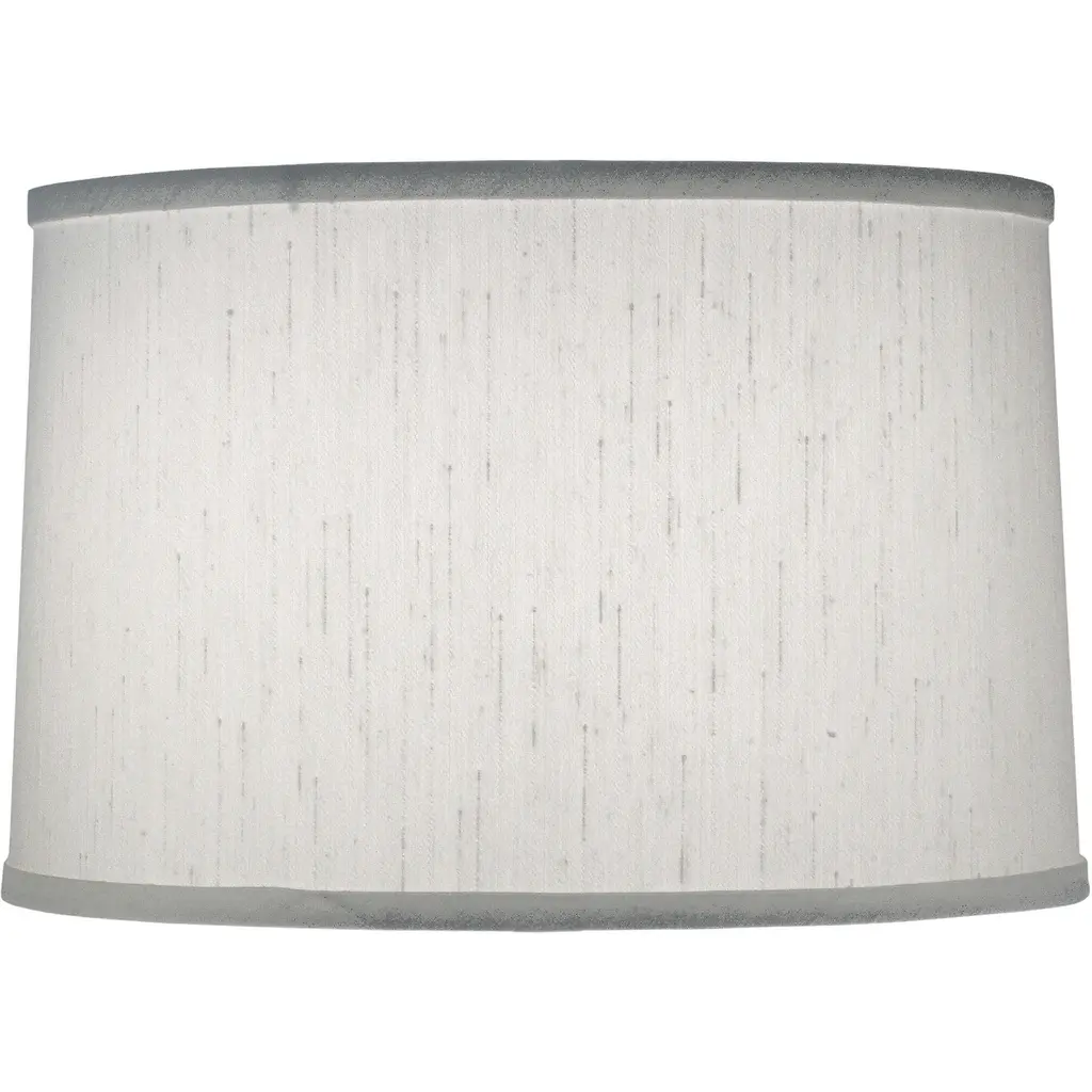 Cool and sophisticated, this modern drum shade offers sleek style update for your favorite lamp. It comes in a platinum grey faux silk fabric and has a slightly darker gray tone trim top and bottom. This shade has a spider fitting and is an unlined, hardback style. From the Springcrest Collection brand of lamp shades. The correct size harp and a finial are included free with this shade.