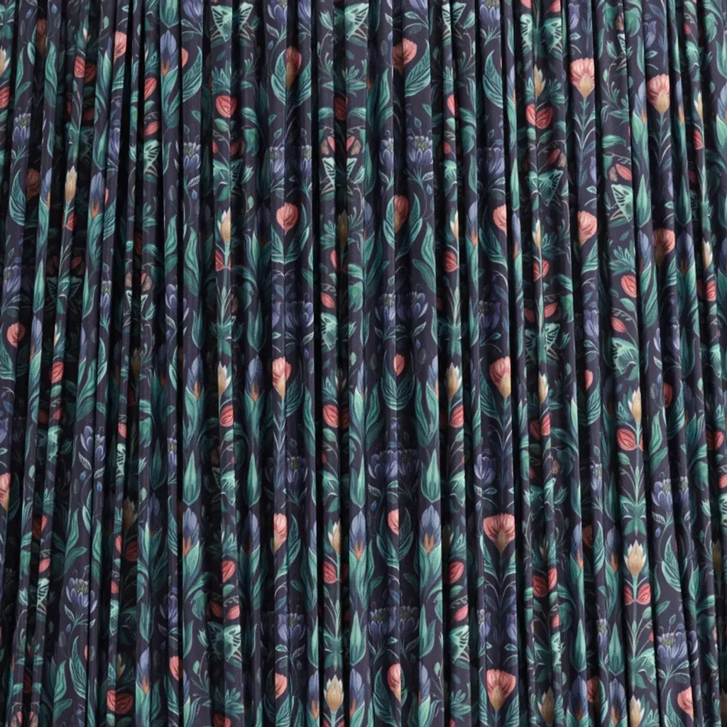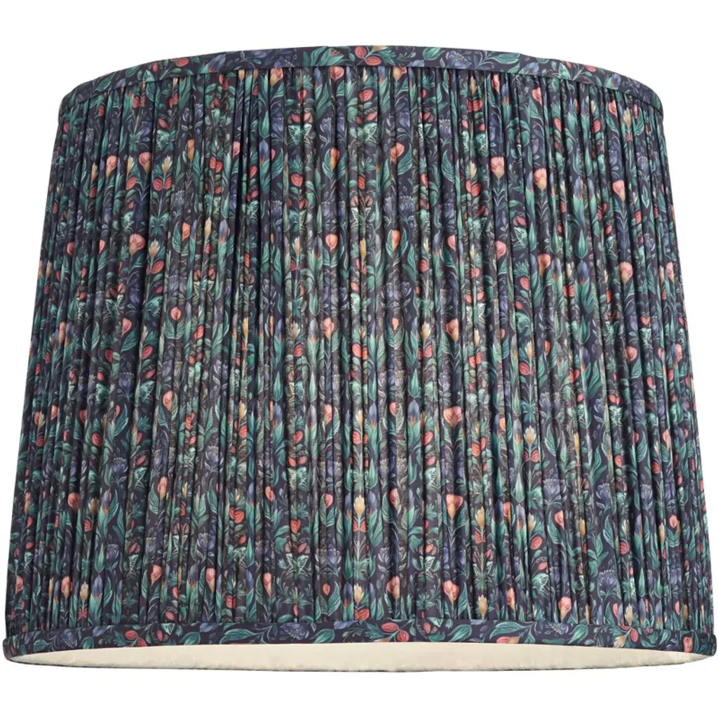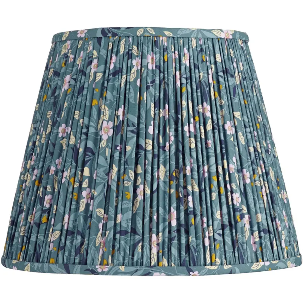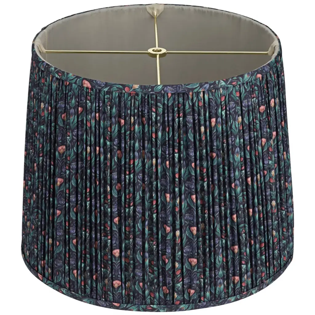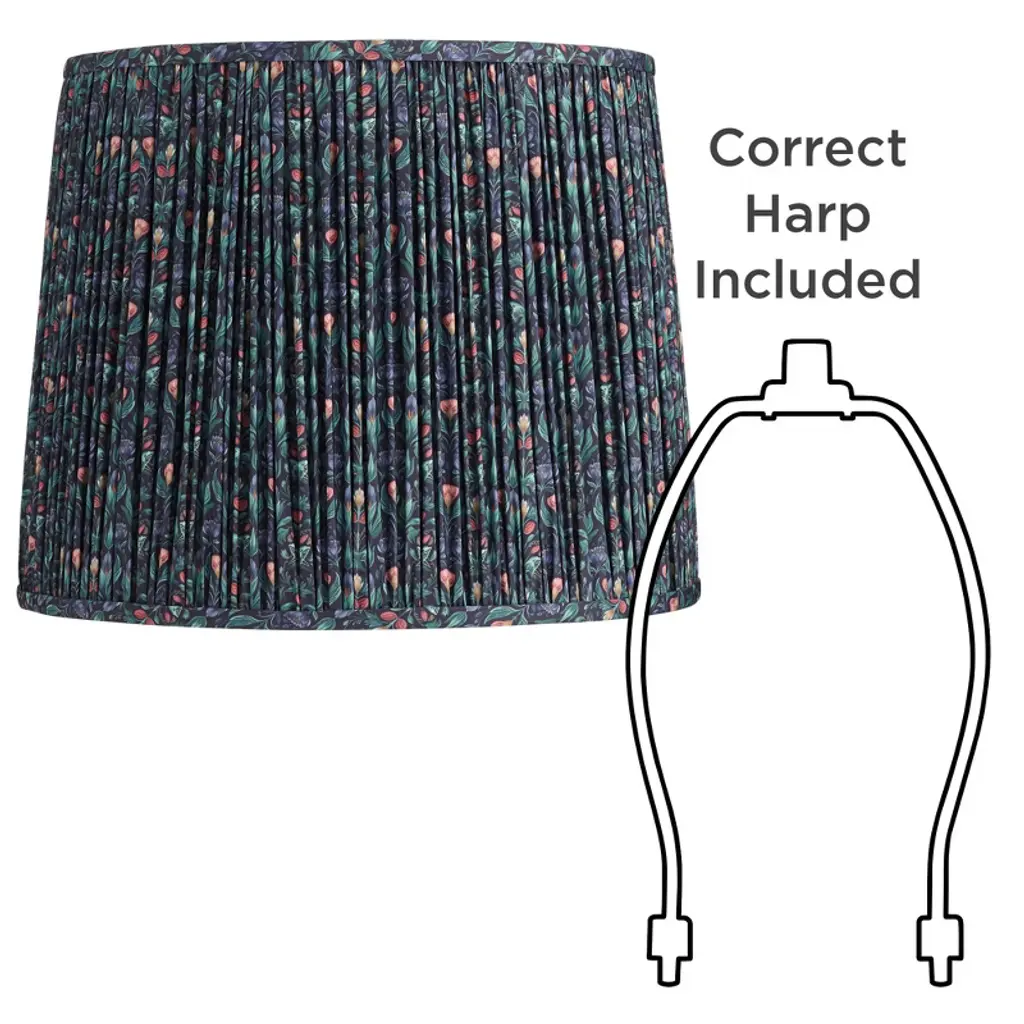 Brighten the look of a fixture or lamp with this shade from the Springcrest brand. The design has a tight pleat using a multi-color green floral patterned fabric. The decorative pattern is set against a blue color background, and the shade has a white polystyrene liner. Comes with the correct sized harp.