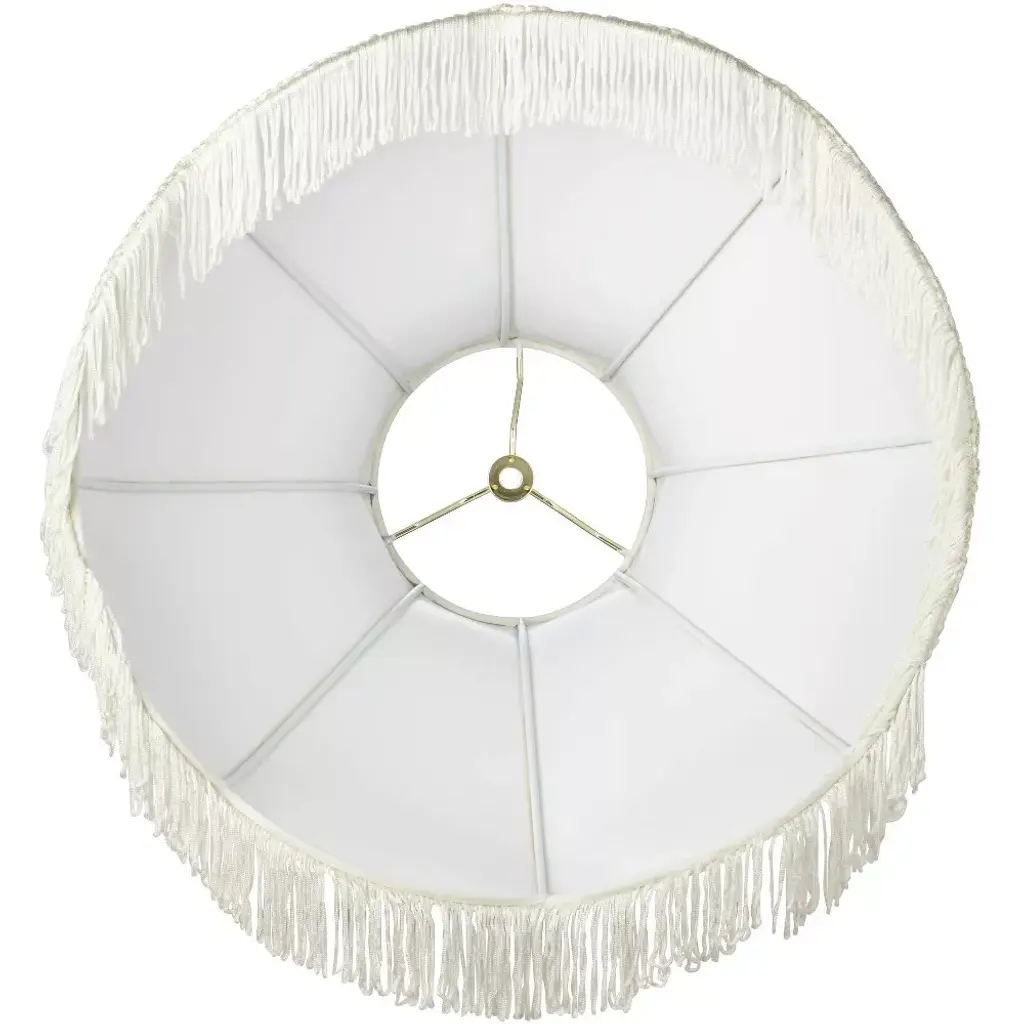 Add visual drama to your decor with this set of 2 lamp shades from the Springcrest Collection brand of shades. Featuring a wonderfully traditional look, the shades have scallop bottom edges that add a touch of romance to table or floor lamps. They come in a cream color fabric that is decorated with a repeating flower bouquet pattern. Shade edges are decorated with braid trim, and the bottom of the shades have a hanging fringe accent.