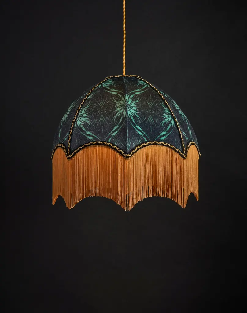 Talon was created by sandwiching two lino print designs together to create a trellis style design, a dense pattern which is great for creating depth and mood. In tones of rich forest and lighter vibrant greens, it works with the gold tassel fringing particularly well.Anna Hayman lampshades create a fantastic centrepiece to a room and work as well on a lamp base as they do as pendants, especially now we are able to offer gold linings. Treat yourself to a beautiful piece of artistry, all made in the UK.Every piece is handmade to order and takes 5-7 weeks to be made and delivered. A piece for your interior to treasure and delight in, these emit a soft glow which lights up a room so beautifully.The Duchess satin lets more light through than the velvet, as does the white lining rather than the gold. You can use a higher wattage/lumen strength bulb if you’d like the heavier velvet fabric.The dimensions are below – please bear in mind fringe colour/length is able to be altered easily as is the braid trim. Do email us for alternative options.Frame Diameter: 22"Frame Height: 12"Fringe Length: 8"Flex and fitting are not included.The attachment for your lamp or pendant fitting is included – choice of lamp or hanging pendant attachment, these are both adjustable for UK or Euro (E27) fittings, as well as US E26. Email us if you’d like further information on this.