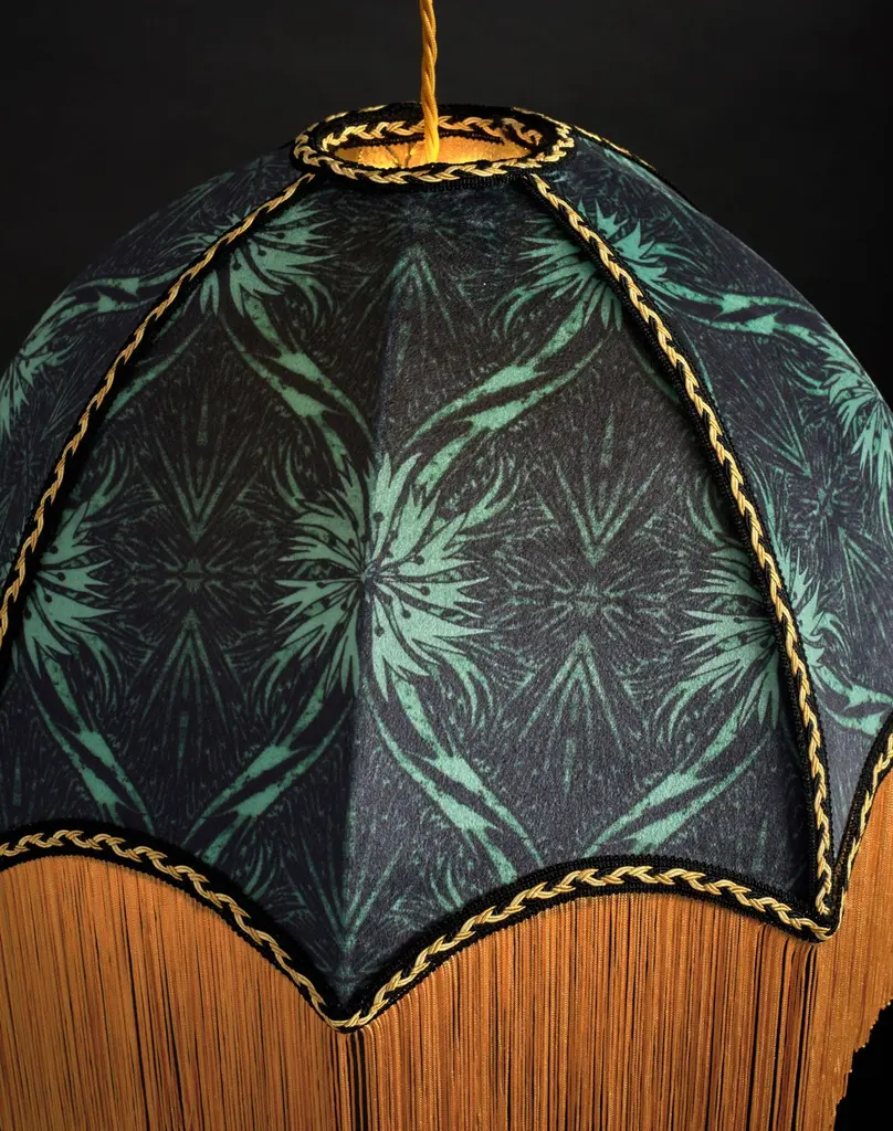 Talon was created by sandwiching two lino print designs together to create a trellis style design, a dense pattern which is great for creating depth and mood. In tones of rich forest and lighter vibrant greens, it works with the gold tassel fringing particularly well.Anna Hayman lampshades create a fantastic centrepiece to a room and work as well on a lamp base as they do as pendants, especially now we are able to offer gold linings. Treat yourself to a beautiful piece of artistry, all made in the UK.Every piece is handmade to order and takes 5-7 weeks to be made and delivered. A piece for your interior to treasure and delight in, these emit a soft glow which lights up a room so beautifully.The Duchess satin lets more light through than the velvet, as does the white lining rather than the gold. You can use a higher wattage/lumen strength bulb if you’d like the heavier velvet fabric.The dimensions are below – please bear in mind fringe colour/length is able to be altered easily as is the braid trim. Do email us for alternative options.Frame Diameter: 18"Frame Height: 10.5"Fringe Length: 8"Flex and fitting are not included.The attachment for your lamp or pendant fitting is included – choice of lamp or hanging pendant attachment, these are both adjustable for UK or Euro (E27) fittings, as well as US E26. Email us if you’d like further information on this.