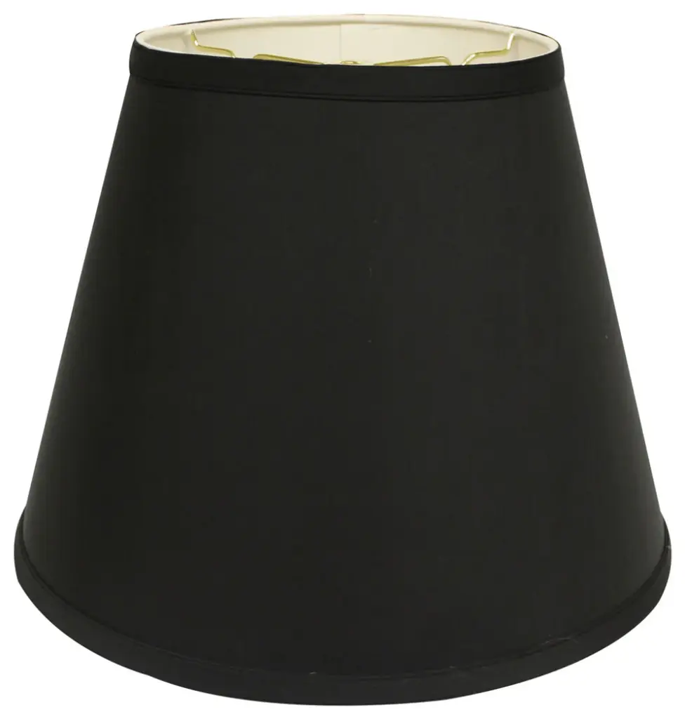 "This Tapered Shallow Drum Hardback Lampshade - Black 8 x 12 x 8.5 is a part of Royal Designs, Inc. Timeless Hardback Lampshade Collection and is perfect for anyone who is looking for a simple yet stunning lampshade. Royal Designs has been in the lampshade business since 1993 with their multiple shade lines that exemplify handcrafted quality and value.Exterior Fabric: Silk-Type Hardback ShantungInterior Fabric: Gold Fabric Hardback LiningWasher: Standard brass-finish spider fitter, use a finial to fasten shade Trim: Fabric on top and bottom is rolled over the edgesFrame: Heavy grade rust resistant brass frameBulb: Suggested maximum wattage is 150-watt for most sizesHeight is measured by vertical height from top to bottom, not slant of the shade"