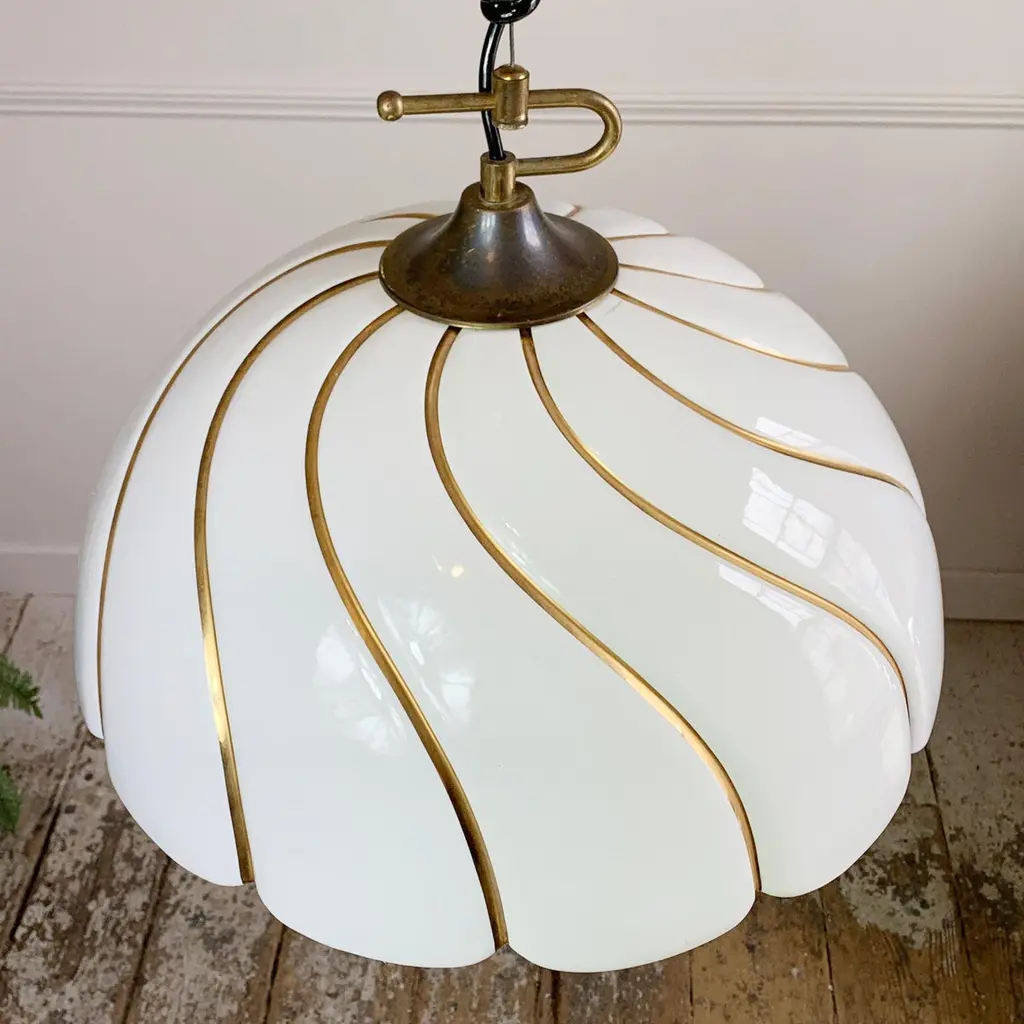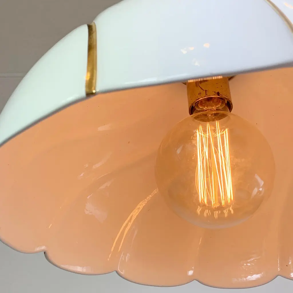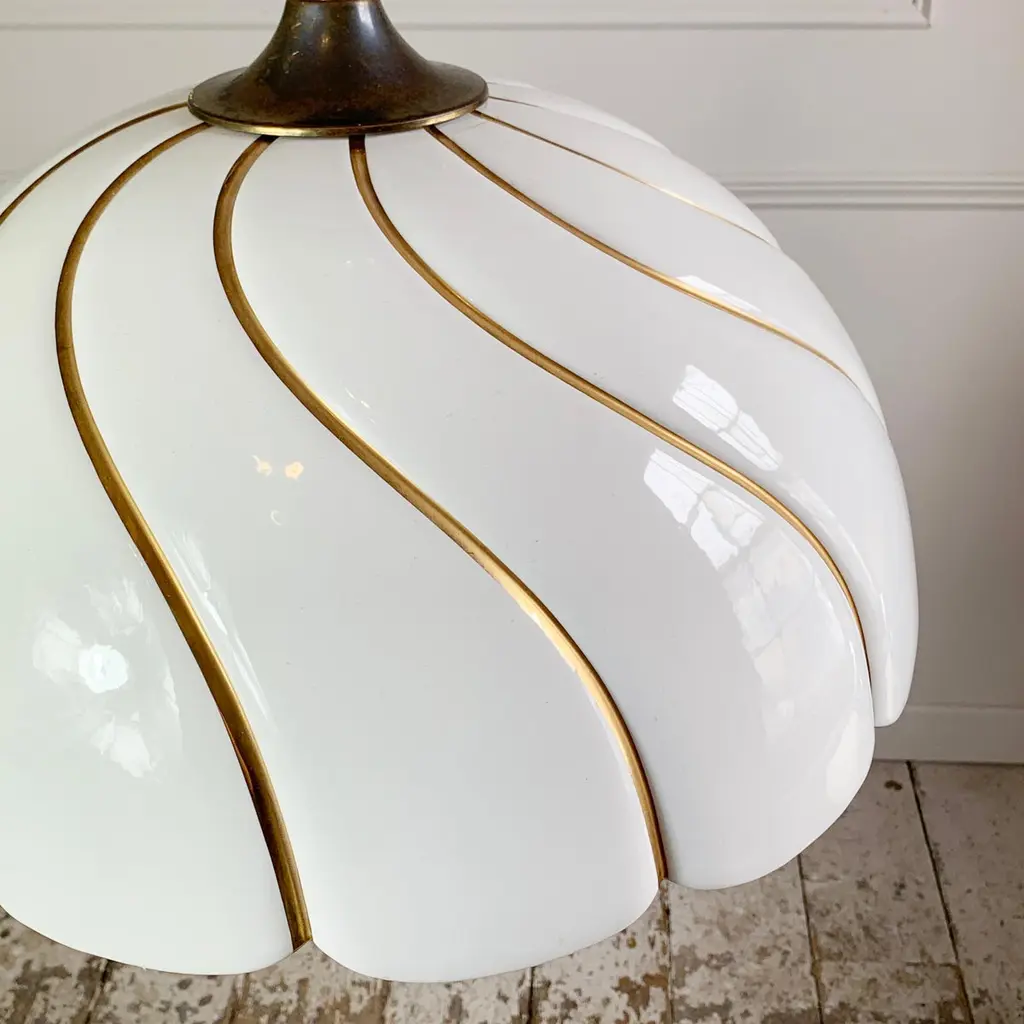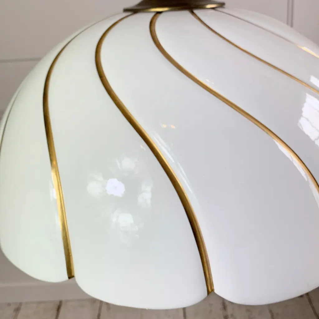 An exceptional ceramic lamp shade by Tommaso Barbi, white glaze with gilt gold swirl detail, the shade is supplied with the original lamp fitting, the twisted black cord is a modern replacement, in the middle of which runs the steel wire that holds the weight of the shade. Both the cord and the steel wire could be replaced if desired.The lamp is of very large proportions and is in superb vintage condition, with no chips or cracks to the ceramic. An item of wonderful design by arguably Italy’s foremost lighting designer.Measures: Height 70cm x Width 47cm. Shade is 30cm Tall. Wire 33cm Long. Rose 10cm Wide.