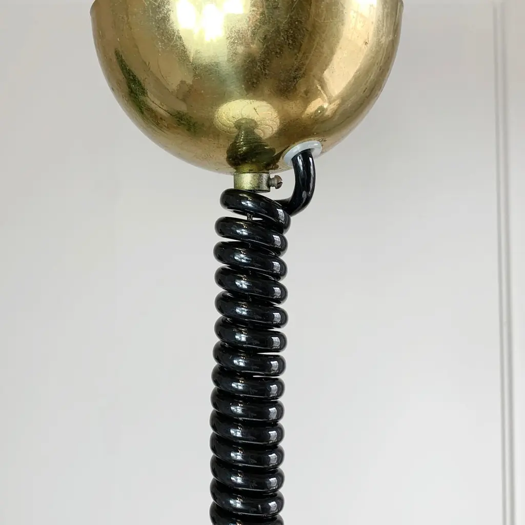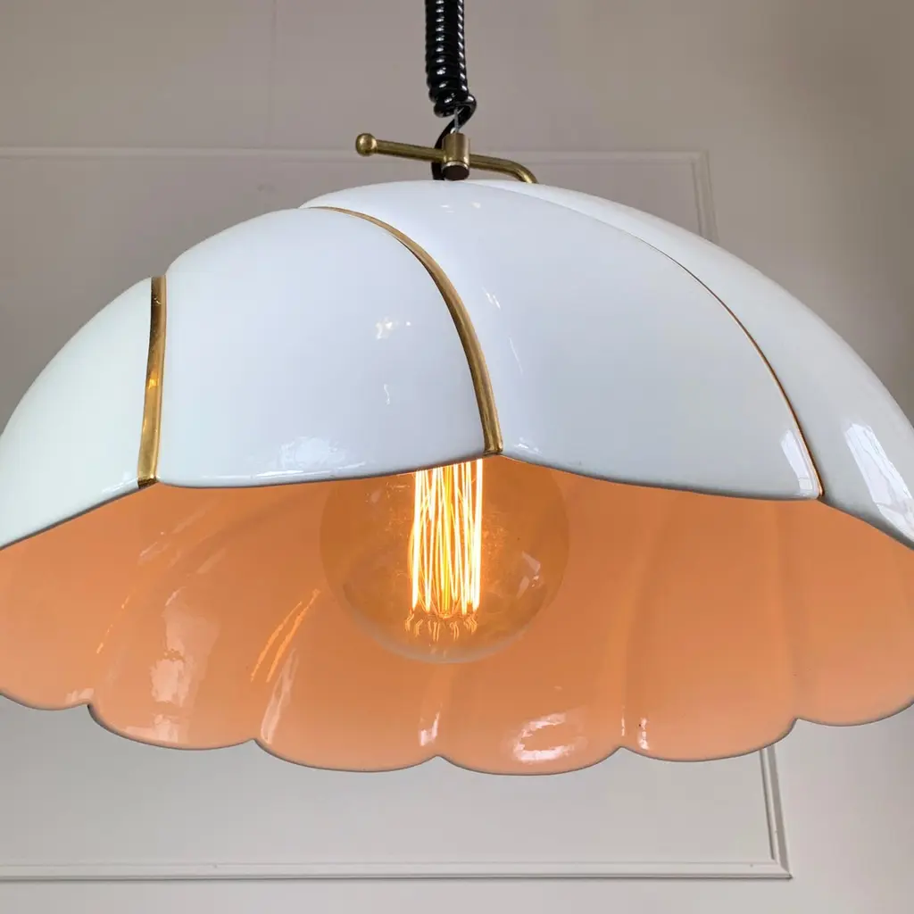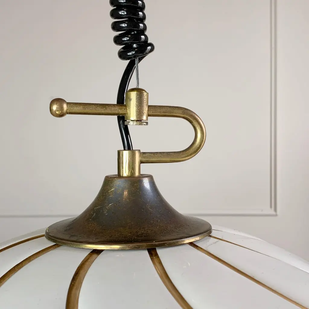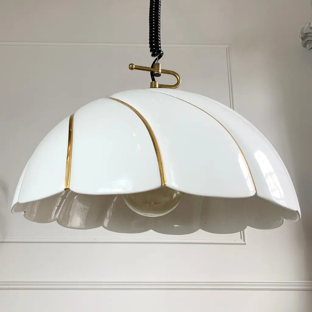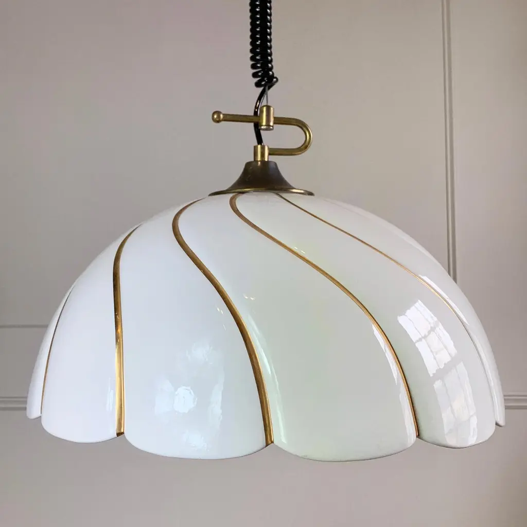 An exceptional ceramic lamp shade by Tommaso Barbi, white glaze with gilt gold swirl detail, the shade is supplied with the original lamp fitting, the twisted black cord is a modern replacement, in the middle of which runs the steel wire that holds the weight of the shade. Both the cord and the steel wire could be replaced if desired.The lamp is of very large proportions and is in superb vintage condition, with no chips or cracks to the ceramic. An item of wonderful design by arguably Italy’s foremost lighting designer.Measures: Height 70cm x Width 47cm. Shade is 30cm Tall. Wire 33cm Long. Rose 10cm Wide.