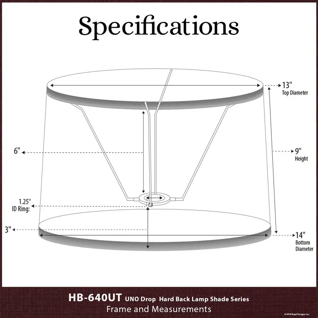 This uno drop shallow drum hardback Lamp Shade is a part of Royal Designs, Inc. Timeless hardback Lamp Shade collection and is perfect for anyone who is looking for a simple yet stunning Lamp Shade. Perfect for updating or repairing an old lamp! Royal Designs has been in the Lamp Shade business since 1993 with their multiple shade lines that exemplify handcrafted quality and value. All dimensions listed (Top x bottom x height).-Shade Dimensions: 13" x 14" x 9" (Top x Bottom x Height)-Shape: Shallow Drum -Fabric shade with white lining.-Uno Drop Style Washer with an inside diameter of 1.25", sized to fit standard medium base sockets, this washer sits 3" from the bottom of the lampshade-Frame: Heavy grade rust resistant metal frame. Thicker than typical standard lamp shades