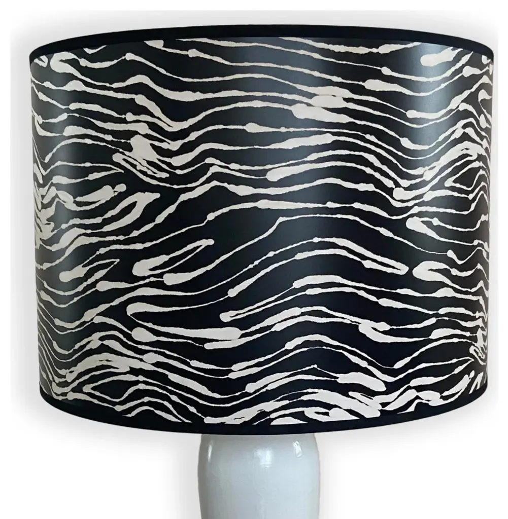 The essence of a wild zebra created with much calmer means. Rice paper soaks india ink organically. There is not way to control the lines as it drinks up the pigment as it pleases.Assembly & Installation Instructions1. Unscrew the finial and remove your old lamp shade from the harp.2. Place your new shade on the harp, and secure with the finial4. Plug the cord in, turn the switch on and ENJOY!Care InstructionsDust with a clean dry clothAvoid harsh chemicals if cleaning toprotect the finishIMPORTANT: Always disconnect the power before installing or replacing bulb and before cleaning or other maintenanceReturn PolicyEach lamp shade is custom printed and made per order, therefore not allowing me to take returns.If there are any issues with your purchase please contact me directly. I want you to be happy!