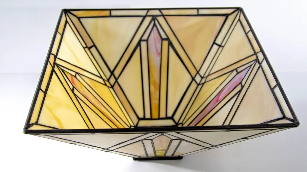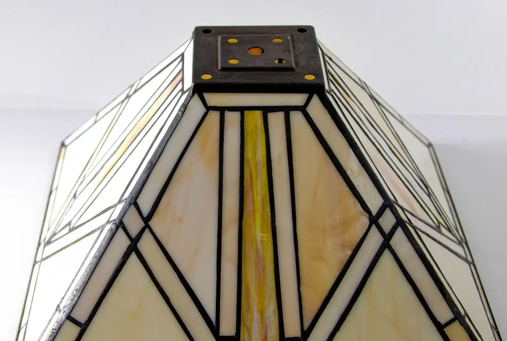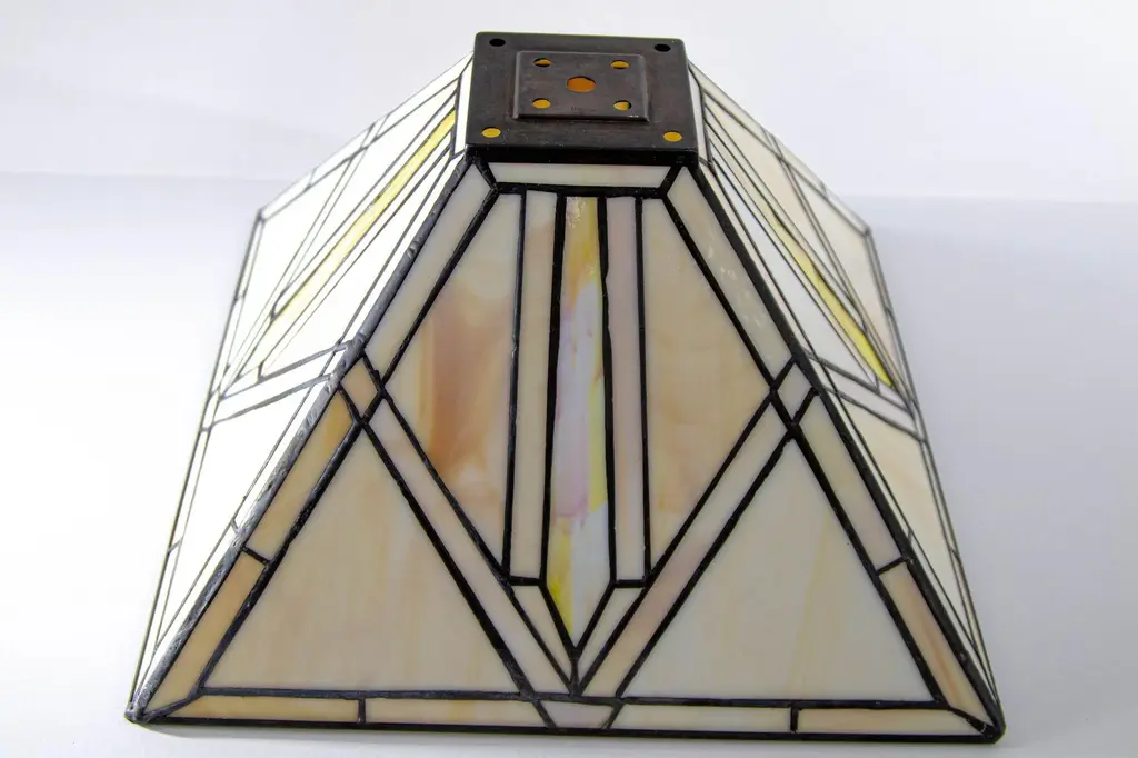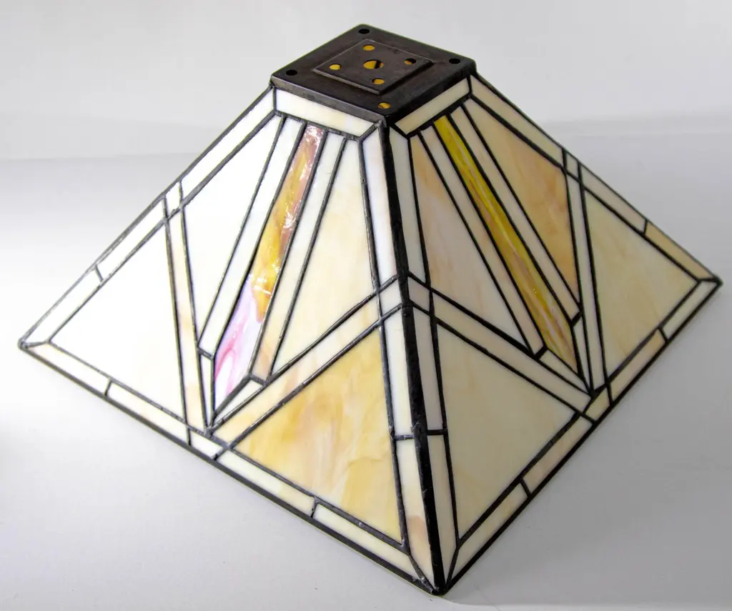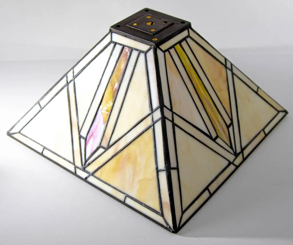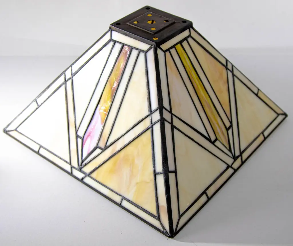 Vintage Arts & Crafts Mission Frank Lloyd Wright Style Stained Glass Lamp Shade. Large square Shape Vintage hand-crafted table lamp shade with intricate designed with mosaic of cut glass each accentuating one another in soft hues of colors in beige and yellow with bronze color metal. Each side of the shade is a unique work of art, with color variations based on natural ingredients inherent in the glass. Mission style lamps now usually refers to a particular shape of lampshade, most commonly produced during the Arts and Crafts Movement. Inspired by Frank Llyod Wright with magical glow of earth tones. Blending art, architecture, and elements of fine design, this hand crafted lamp shade is an exquisite 360-degree sculptural work of art. The neutral palette and pyramid shape make it a great addition to any living room or office, used it as a replacement on your Mission table lamp, or as a ceiling shade. New old vintage stock never used. Multiple available. Art Deco, Mission, Tiffany, Arts and Crafts style Stained Glass Lamp Shade Frank Lloyd Wright Style Inspired. Dimensions: 12 in x 12 in square x 7 in H.