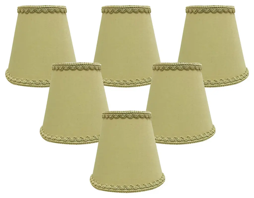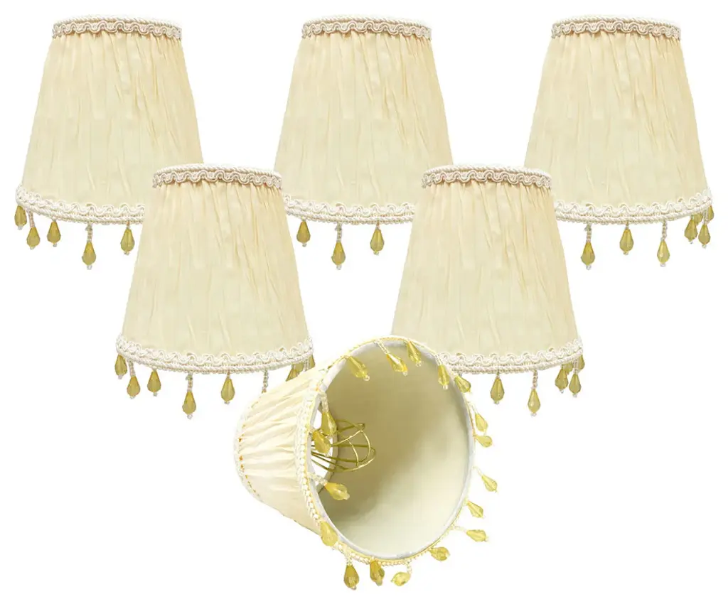 Royal Designs 5-Inch chandelier shades are handmade. You can use them for your chandeliers, wall sconces or small accent lamps. These lamp shades are highest quality and sure to bring a sense of style to any room.-Shade Dimensions: 3" x 5" x 4.5 (Top x Bottom x Height) -Shape: Empire Chandelier Lamp Shade with Designer Trim-Fabric: Hand Tailored Silk-Type Shantung Fabric, No Lining-Fitter: FLAME CLIP, FC, Fitter designed to fit over a Candelabra bulb base., Most clip-on lampshades are designed with double clip, . Suggested maximum wattage is 60-watt candelabra bulb.-Frame: Quality metal frame