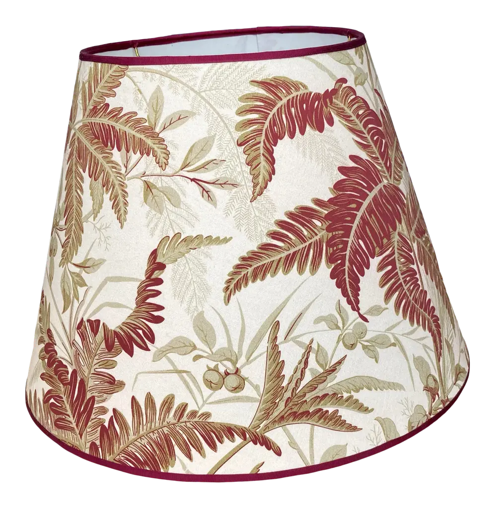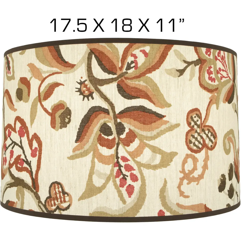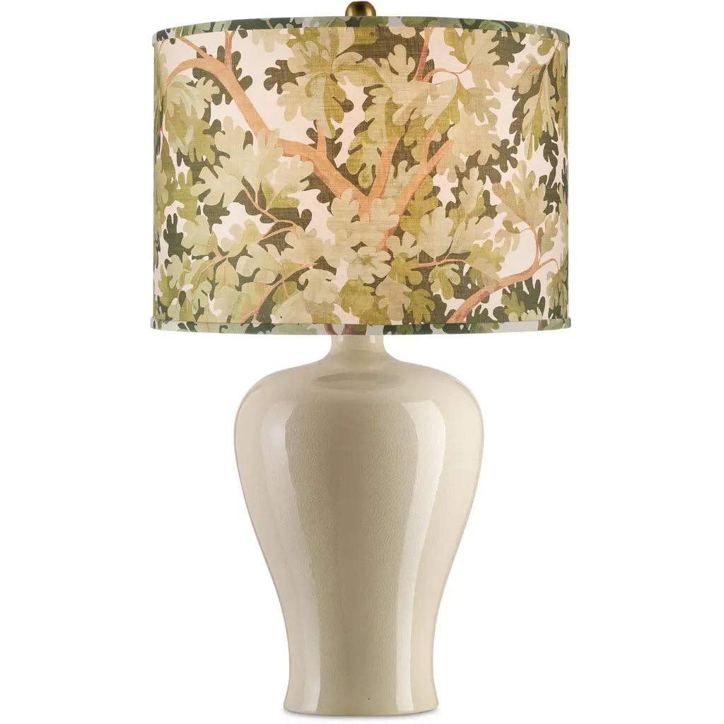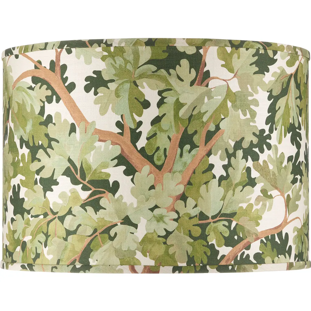 The leaves and branches of an oak tree wrap the drum-shaped, green fabric lampshade from design partner Lacefield Designs.