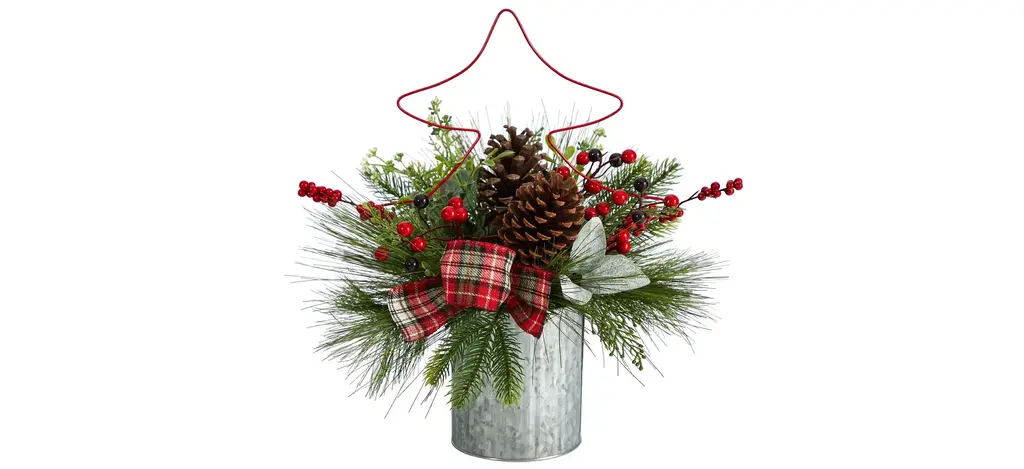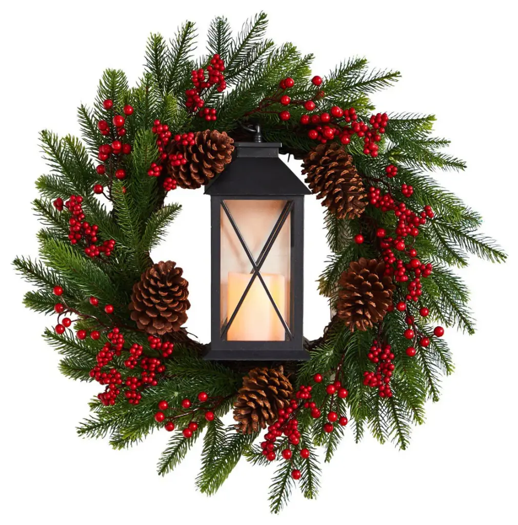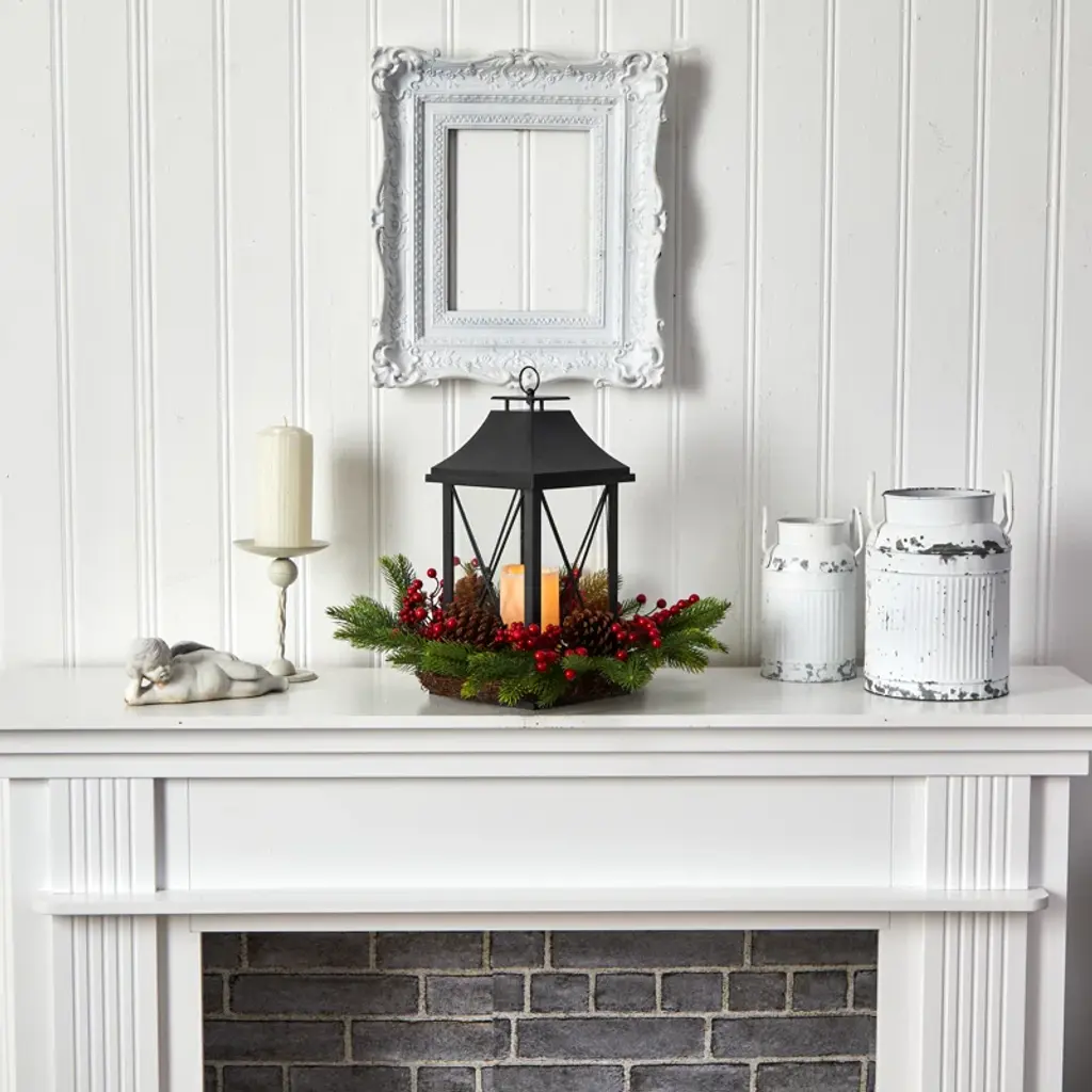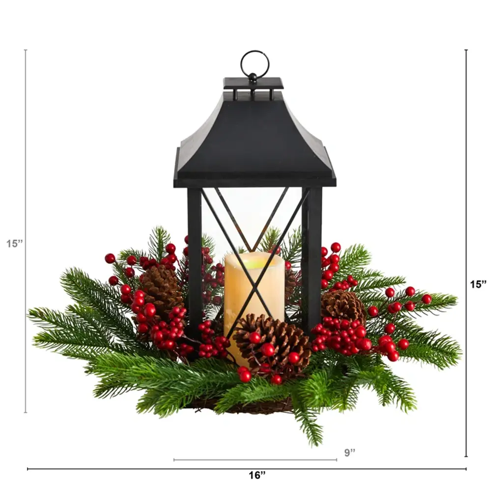 16in. Holiday Christmas Berries, Pinecones And Greenery With Lantern And Included Led Candle Artificial Table Arrangement