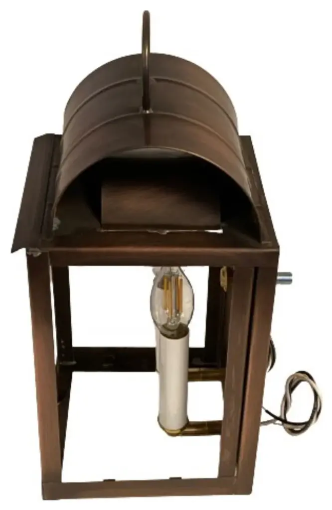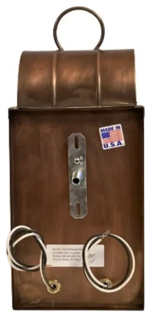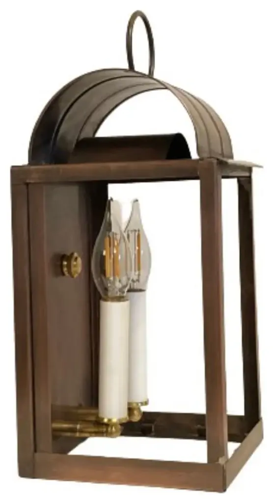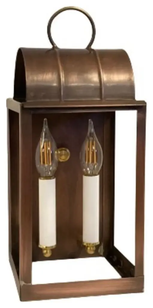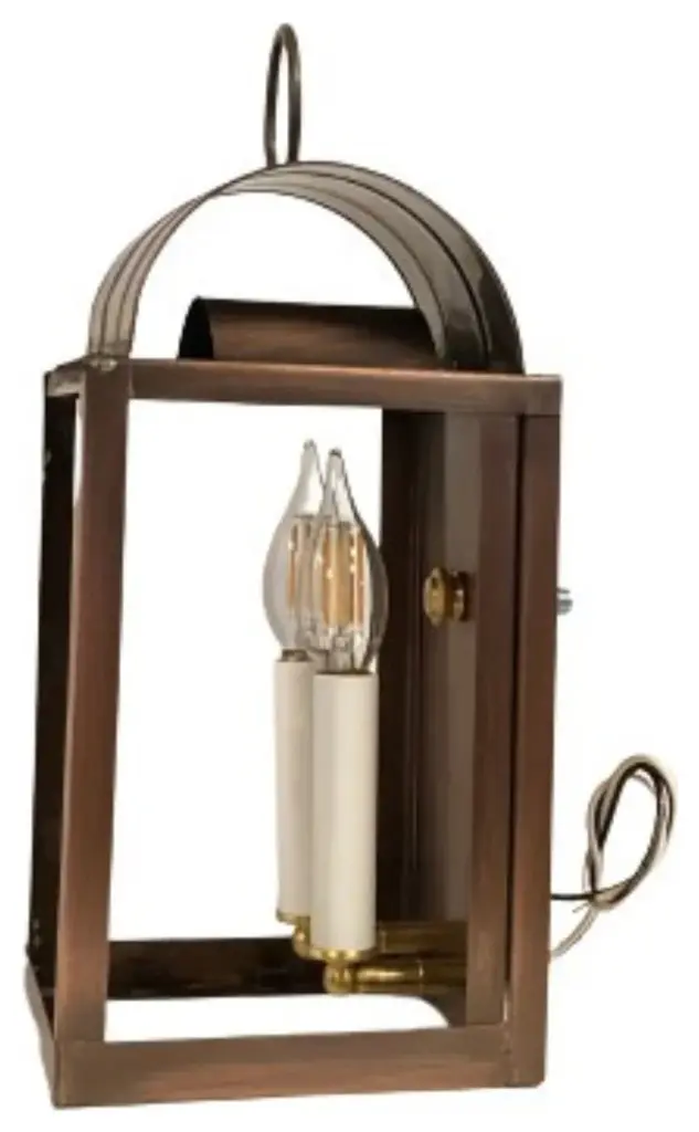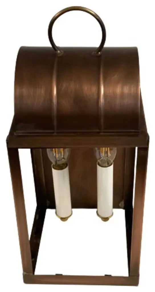 OUR "1860 Lantern" CLEAR GLASS wall lantern. Solid copper antique finish waxed, will patina over time. The 1860 lantern has two candelabra sockets with solid brass check rings. Maximum 60 watts per socket. 2 LED 40-watt bulbs provided for an inviting light with plenty of illumination. This lantern has an open bottom which allows light to come down below the fixture as well as for easy cleaning. Hi-pot tested with UL listed electrical components to assure a safe wet location lantern. A great lantern for front or side doors, back deck, garage and around your home, indoor over the fireplace, anywhere you would like a beautiful fixture. This lantern is 6" wide by 6 1/4" projection and 14" tall from the open bottom to the top of the solid brass handle. The electrical components are assembled to make electric candle holders which will hold a dimmable LED bulb. For fifty years the Hutton family has been making solid copper lanterns by hand, in northeastern Pennsylvania. We are proud to offer these fine outdoor and indoor lanterns to you. Standard UL code mounting, cross bar on outlet box, threaded nipple with a large solid brass cap. Handcrafted, a return is at customer''s expense. We make every effort to create lanterns which are close in color. We use a natural oxidation which may vary from fixture to fixture. Double strength clear glass. Each piece of glass is unique. Our lanterns will patina over time. Hutton Metalcrafts, Inc. We are a hand-crafted studio in northeastern Pennsylvania. Our lanterns are made for you by hand. We do not have fancy printed boxes or form fit packing. Our lanterns are packed in bubbles and double strength cardboard boxes. All lanterns are new. If you are not looking for hand crafted rustic lanterns, I would not suggest you purchase our solid copper handmade rustic lanterns. Hutton Metalcrafts, Inc established in 1973. Made in the USA.